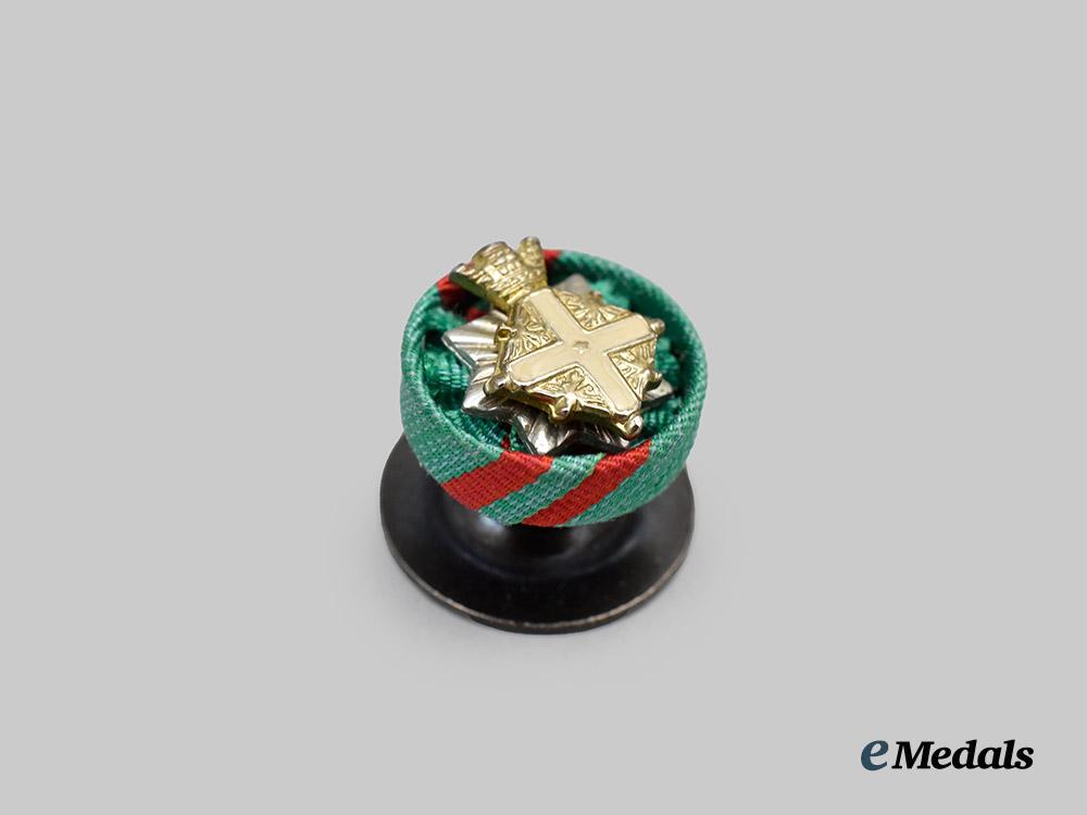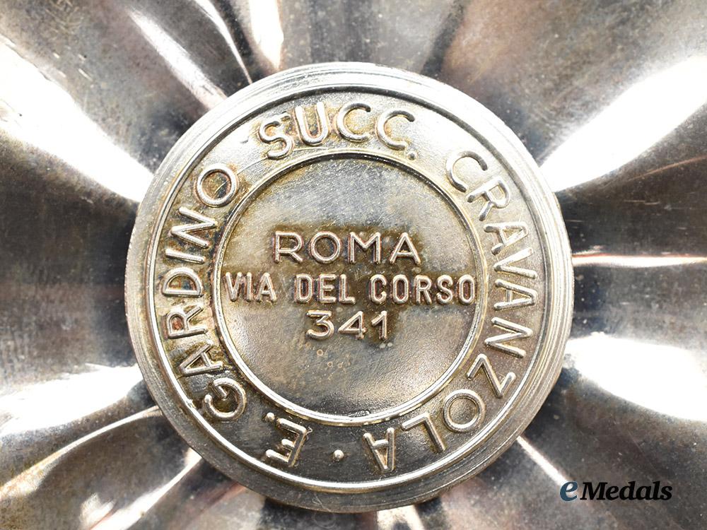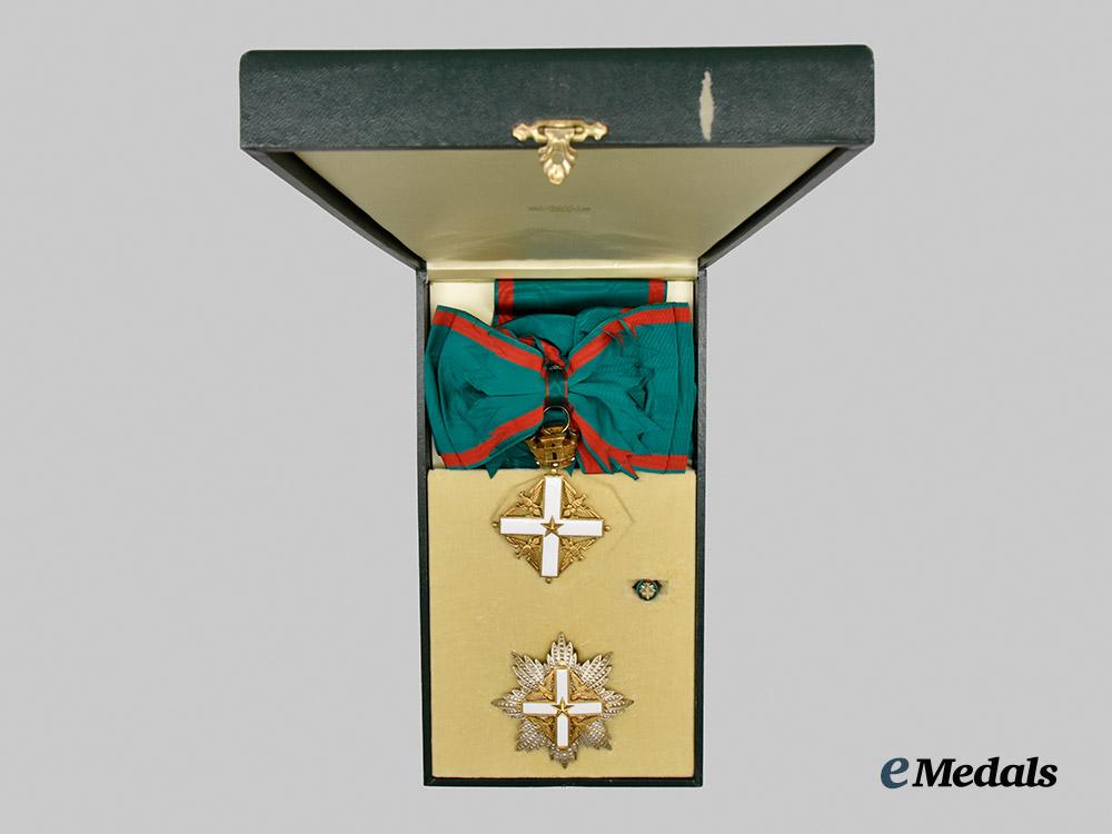 (Ordine al Merito della Repubblica Italiana, Commentadore). Instituted March 3rd, 1951. A Grand Cross Set in Case, comprising the Grand Cross Badge in silver gilt, featuring a white enamelled cross with eagles in each quadrant, a five point star in the center of the cross, reverse mirrors the obverse, surmounted by a crown with white, red, green and black painted accents, measures 70.4mm (w) x 94.9 mm (h - inclusive of crown suspension), worn on full length grand cross sash, marked 925 on the suspension ring, enamels intact, bar within crown attaching cross is partially broken, in extremely fine condition. The Star of the Order, a silver eight point star with faceted rays, the center in 18K Gold has been superimposed on the star featuring a white enamelled cross with eagles in each quadrant, a five point star in the center of the cross, the reverse bearing a vertica pin assembly, maker cartouche in the center denoting CRAVANZOLA E. GARDINO SUCC., measures 85.6 mm (w) x 85.1 mm (h), weighs 64.5 grams, enamels intact, in extremely fine condition. Accompanied by a boutonniere featuring a Grand Cross device in the center.