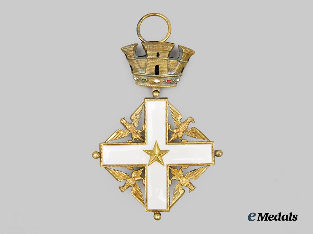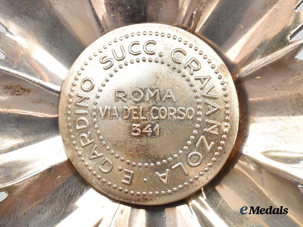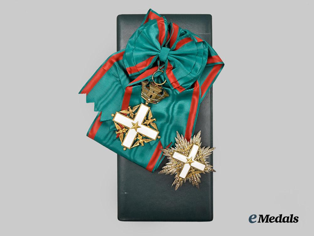 Instituted March 3, 1951. Type I (1951-2001). In Silver, the Grand Cross presenting a white enamel cross with eagles in each quadrant and a central five point star, the reverse mirrors the obverse, surmounted by a large crown, measures 70.2 mm (w) x 96.3 mm (h), marked 800 for silver fineness on ring, worn on original full length sash, enamels intact, light gilt wear, in extremely fine condition. The Star of the Order, featuring an eight point silver star with faceted rays, the obverse presenting a white enamel cross with eagles in each quadrant and a central five point star, the reverse features a single vertical pin suspension, reverse cartouche removed (but included in case) denoting Cravanzola E. Gardino as the maker, measures 82.3mm (w) x 84.8 mm (h), weighs 44.6 grams, light wear, in extremely fine condition.