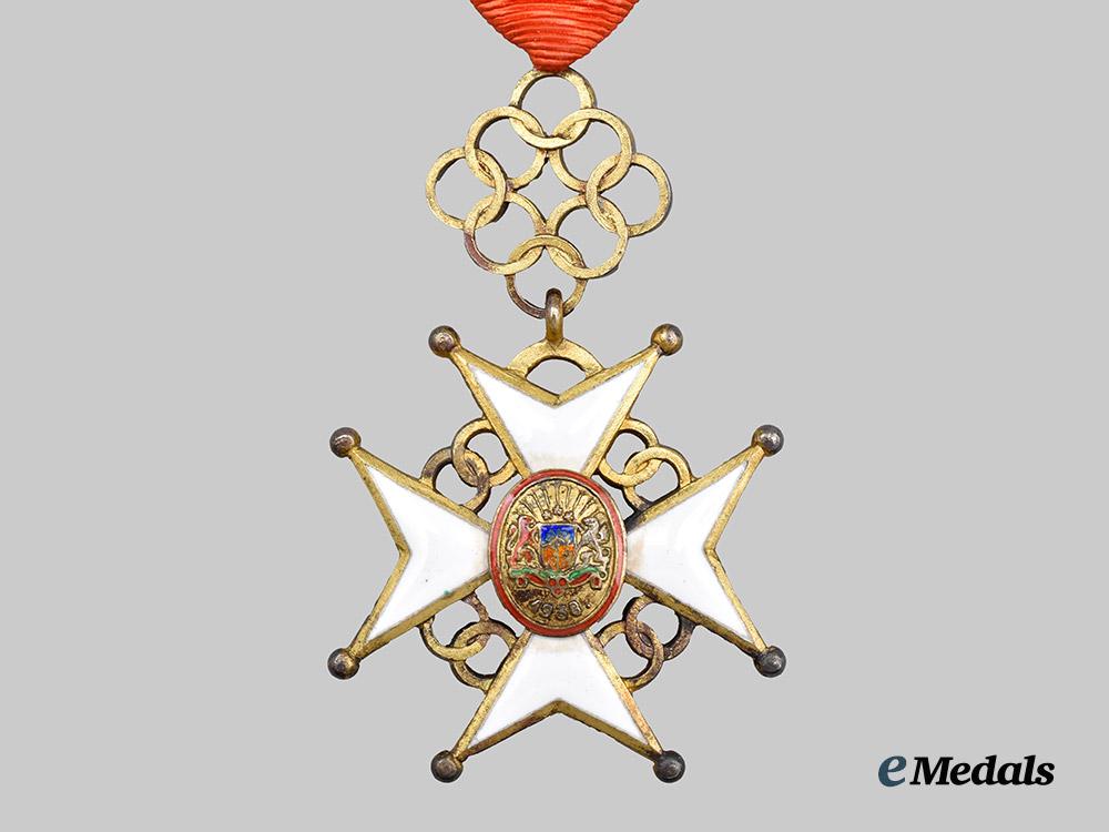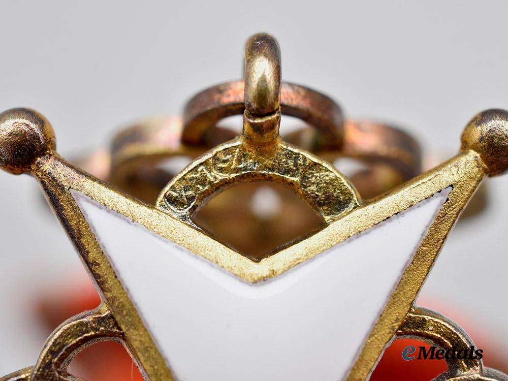 (Atzinības Krusts). Re-Instituted in 1938. (1939-1940 issue). A silver gilt Maltese Cross with white enamelled arms and ball finials, with dual intertwined rings in the quadrants between the arms of the cross, the obverse with a central oval gilded medallion bearing the Coat of Arms of Latvia and dated “1938”, the reverse with a similar central oval gilded medallion bearing the Coat of Arms of the Duchy of Courland and Semigallia and dated “1710”, suspended from a suspension device consisting of eight intertwined rings from its period original ribbon featuring a modern replacement safety pin for attachment to a uniform, marked with the text “Pour les Honnêtes Gens” on the edges of the arms, measuring 35.8 mm (w) x 36.0 mm (l), weighing 22.65 grams.