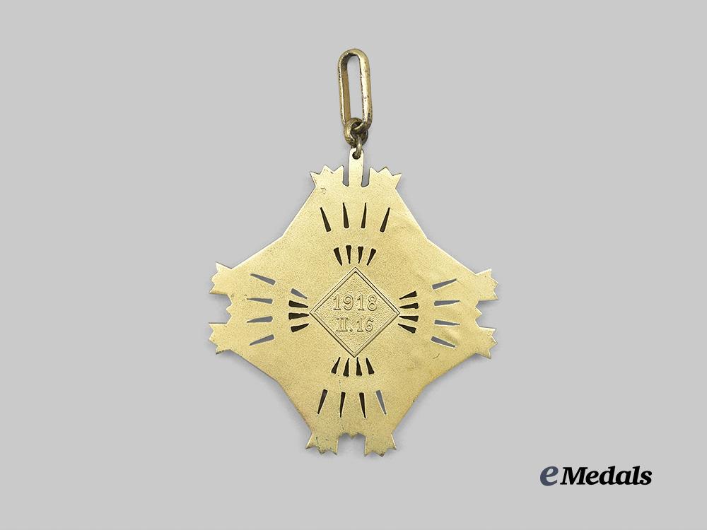 (Didziojo Lietuvos Kunigaikscio Gedimino ordinas). Instituted in 1927. Type I. In silver, silver gilt and enamels, featuring white enamelled arms with thick silver borders, and three silver gilt rays in each quadrant, the obverse bears the red enamelled Columns of Gediminas, unmarked, measures 63.6 mm (w) x 67.5 mm (h), reverse is plain with central embossed date 1918 II.16, light enamel contact, minor loss of gilt, remains better than very fine.