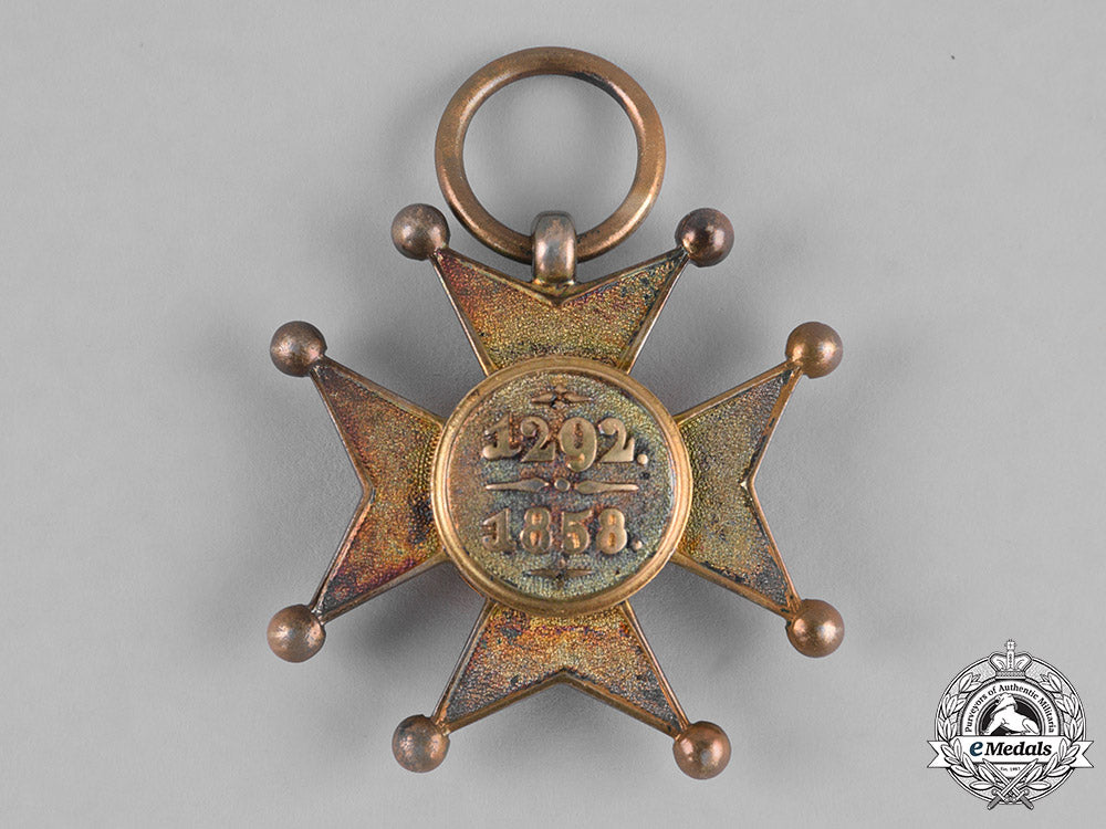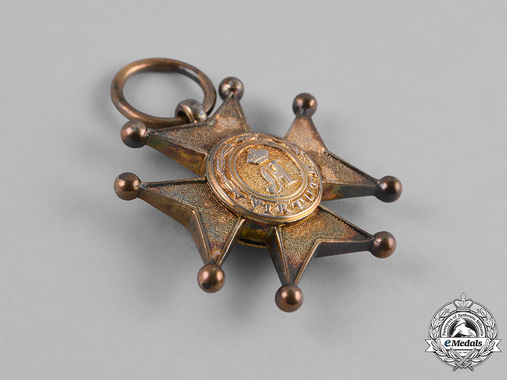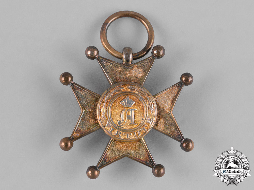 Ordre de Mérite civil et militaire d’Adolphe de Nassau. Instituted 1858. Civil Division, Type I. In silver gilt, obverse centre bears the letter ""A"" in Gothic script crowned by an imperial crown, with surround depicting laurels and motto ""Virtute"", reverse centre applique presents the dates ""1292"" (the year that Adolf of Nassau-Weilburgwas crowned as King of the Romans) and ""1858"" (order institution date by Adolphe, Duke of Nassau), measuring 31.5 mm (w) x 31.2 mm (h), scattered gilt wear, near extremely fine.