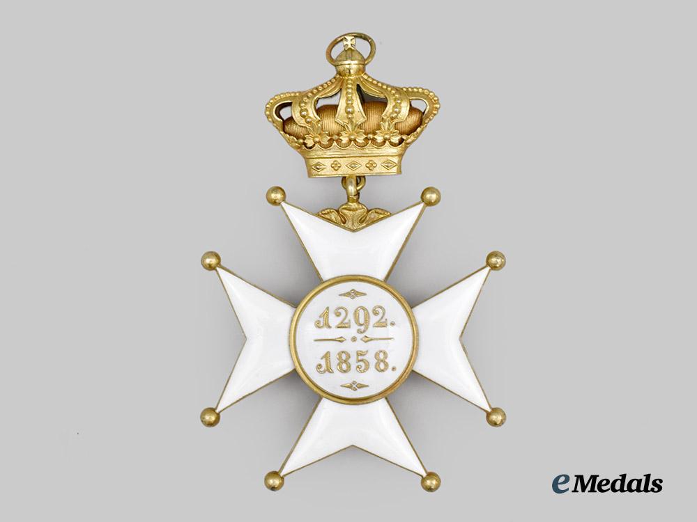 2. The Sash Badge. A silver gilt Maltese Cross with white enameled arms and dual gilded ball finials, the obverse with a circular central white enameled medallion bearing the crowned Royal cypher of Duke Adolphe of Nassau, surrounded by a blue ring of enamels depicting laurels and the motto “Virtute” in capitalized lettering in Gold, the reverse with a larger central medallion in white enamel dated “1292 - 1858” in gilt, suspended from a partially hollow silver gilt Royal Crown using its period original and full length sash ribbon, unmarked, measuring 66.9 mm (w) x 71.9 mm (l), weighing 100.74 grams.