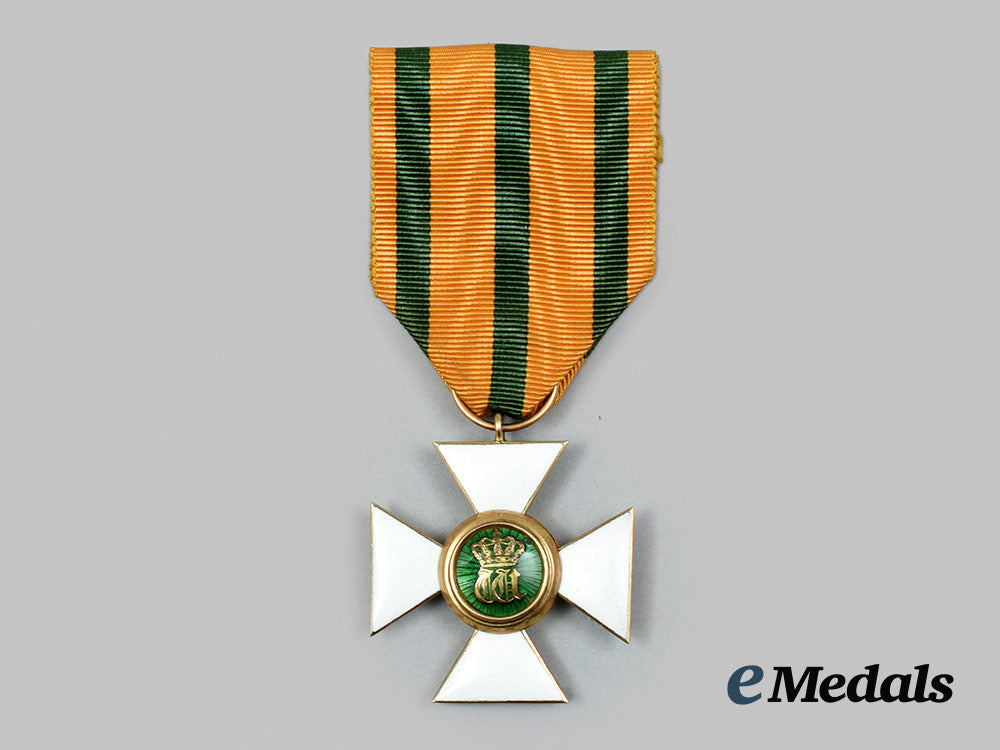 (Ordre de la Couronne de Chêne). Instituted in 1841. In 18K Gold with green and white enamels, weighing 9.6 grams, export marked with the head of Mercury on the integral ring, measuring 33.5 mm (w) x 37 mm (h) inclusive of its integral ring suspension, scattered spotting evident on the enamels but they are all intact, original ribbon, extremely fine.