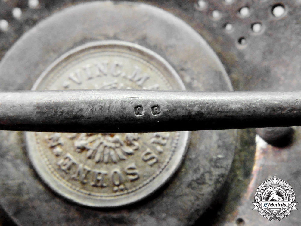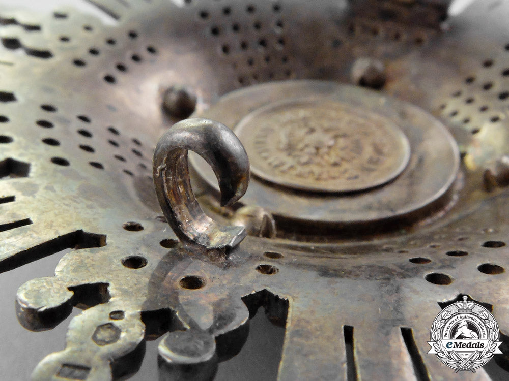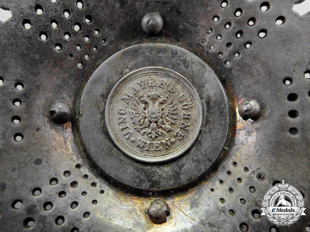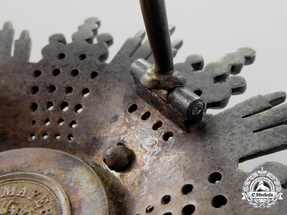 Montenegro; Multi-piece construction, Gold cypher and lettering on a silver with red, white and blue enamelled cross, mounted to a sixteen-pointed silver star base, assay city marked "A" (Vienna) in two locations on the pin, maker marked "VINC. MAYER'S SÖHNE WIEN" on the reverse cartouche, 85 mm (w) x 84.5 mm (h), vertical pinback, intact enamels, extremely fine.