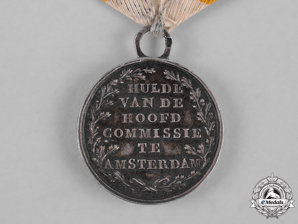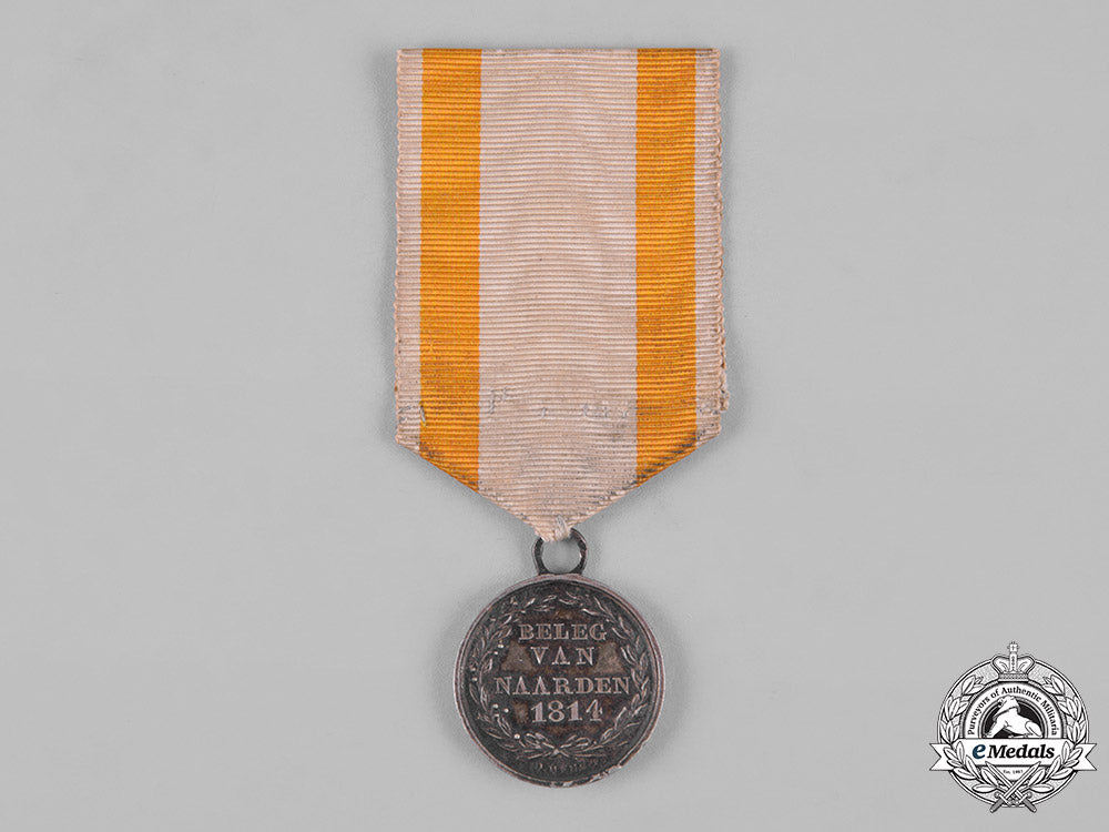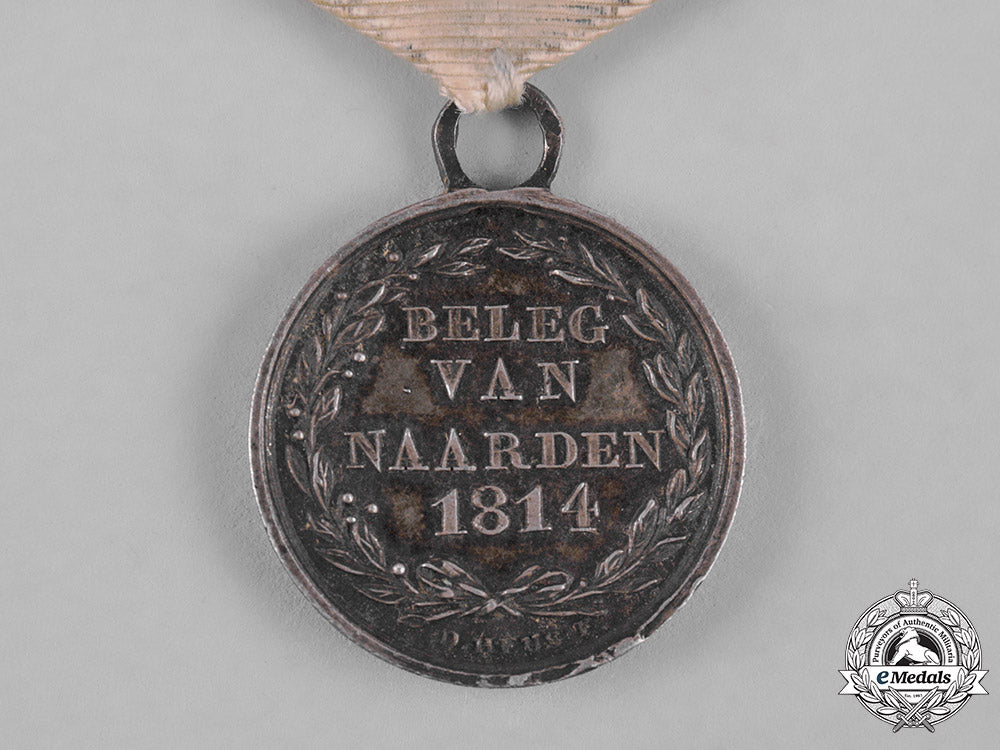 Napoleonic Period. Constructed of silver, a Napoleonic medal for the resistance of the Siege of Naarden, obverse inscribed BELEG VAN NAARDEN 1814 (Naarden Siege 1814) encircled by an engraved laurel wreath, the reverse with the inscription HULDE VAN DE HOOFCOMMISSIE TE AMSTERDAM (Grace from the High Commission at Amsterdam), also with surrounded laurel wreath, measuring 22.40 mm (w) x 27.53 mm (h- inclusive integral ring), featuring stamp of D. HEUS F., ring hallmarked by early Dutch hallmark denoting antique silver duty mark dating from annexation of the Kingdom of the Netherlands by the Empire of France, hallmarked as well by late proof Dutch hallmark (1953-) symbolising silver fineness of .835, toned silver, accompanied by replaced ribbon, extremely fine.