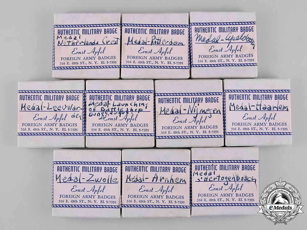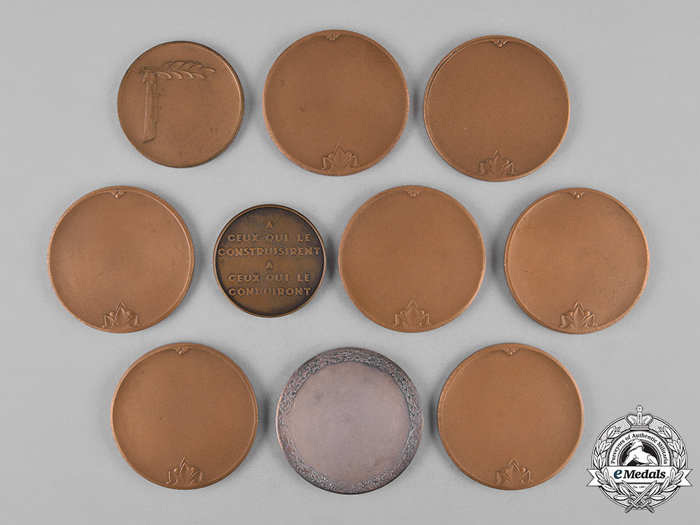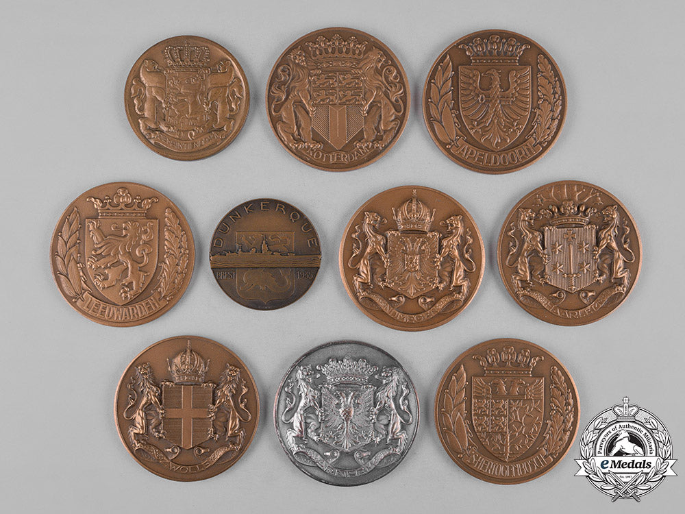 Nine Netherlands, Kingdom Medals: City of Apeldoorn Medal (in bronze gilt, obverse illustrating the city's coat-of-arms, inscribed "APELDOORN" below, reverse with a floral design, measuring 40.5 mm in diameter); City of Arnhem (in silvered bronze, obverse illustrating the city's coat-of-arms, inscribed "ARNHEM" below, reverse illustrating a full-wreath, measuring 40.3 mm in diameter); City of Haarlem Medal (in bronze gilt, obverse illustrating the city's coat-of-arms, inscribed "HAARLEM" below, reverse with a floral design, measuring 40.5 mm in diameter); City of Leeuwarden Medal (in bronze gilt, obverse illustrating the city's coat-of-arms, inscribed "LEEUWARDEN" below, reverse with a floral design, measuring 40.3 mm in diameter); City of Nijmegen Medal (in bronze gilt, obverse illustrating the city's coat-of-arms, inscribed "NIJMEGEN" below, reverse with a floral design, measuring 40.5 mm in diameter); City of Rotterdam Medal (in bronze gilt, obverse illustrating the city's coat-of-arms, inscribed "ROTTERDAM" below, reverse with a floral design, measuring 40.3 mm in diameter); City of 'S-Hertogenbosch Medal (in bronze gilt, obverse illustrating the city's coat-of-arms, inscribed " 'S-HERTOGENBOSCH" below, reverse with a floral design, measuring 40.3 mm in diameter); City of Zwolle Medal (in bronze gilt, obverse illustrating the city's coat-of-arms, inscribed "ZWOLLE" below, reverse with a floral design, measuring 40.3 mm in diameter); Kingdom of the Netherlands Medal (in bronze gilt, obverse illustrating the country's coat-of-arms, inscribed "JE MAINTIENDRAI" below, reverse illustrating a branch of laurel leaves, with a ribbon dangling from the branch, measuring 35 mm in diameter); and Launching of the Battleship Dunkerque at Brest Commemorative Medal 1935 (in bronze, cornucopia hallmarked and marked "BR" (bronze) on the edge, engraver marked "P. TURIN" on the obverse, measuring 31 mm in diameter). Ranging from very fine to extremely fine.