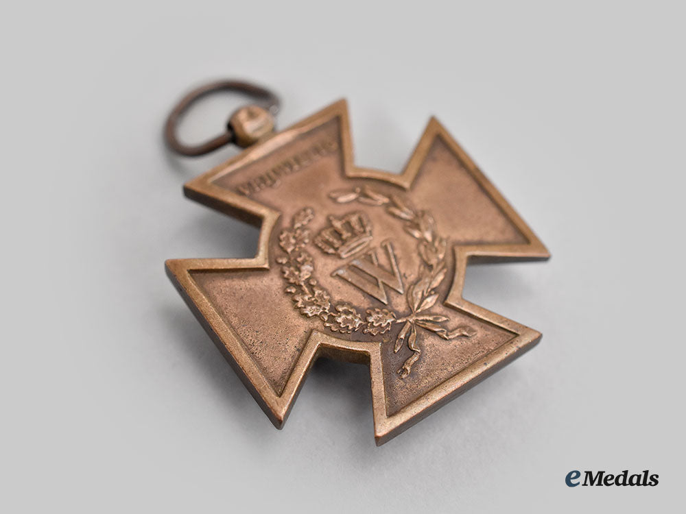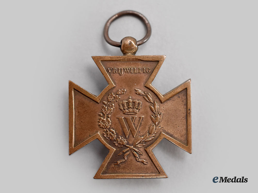 (Het Metalen Kruis). Instituted in 1831. In bronze gilt, inscribed "VRIJWILLIG" (Voluntarily) above the "W" monogram on the obverse identifying it as the volunteer's version, measuring 29.5 mm (w) x 34.3 mm (h) inclusive of its laterally-pierced ball suspension, scattered gilt wear evident on the reverse, contact marks overall, without ribbon, very fine.
