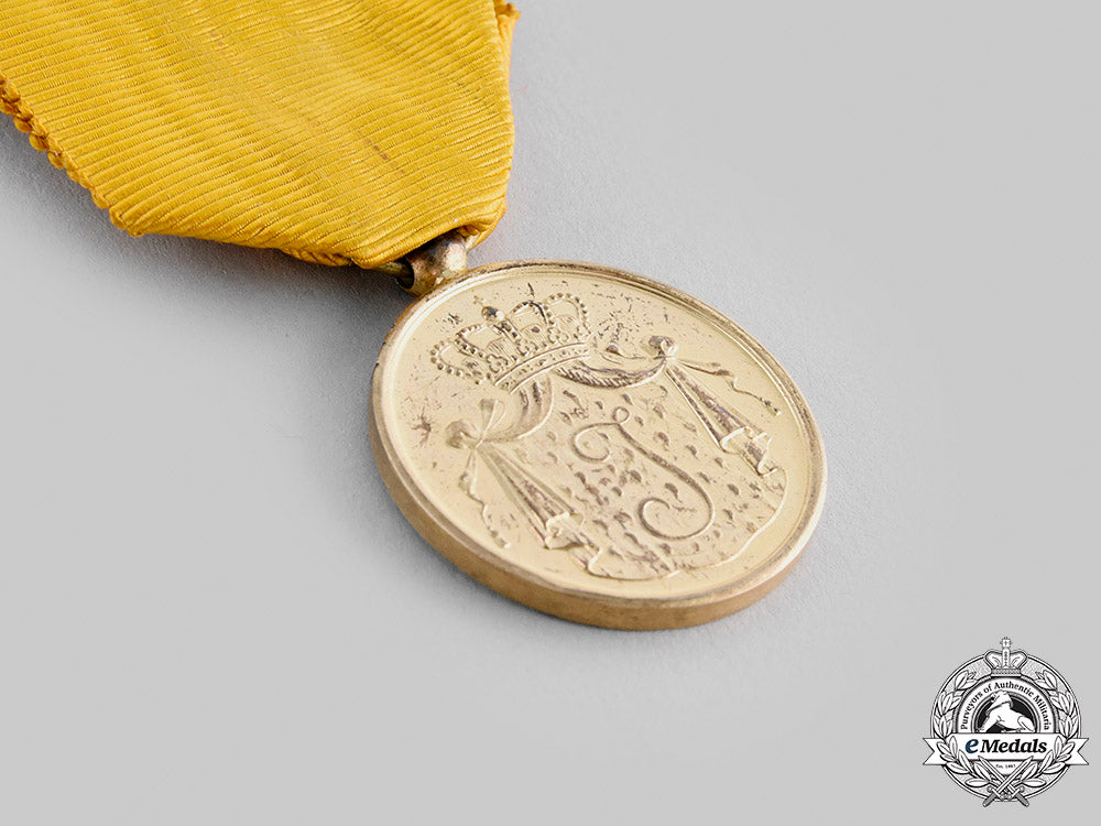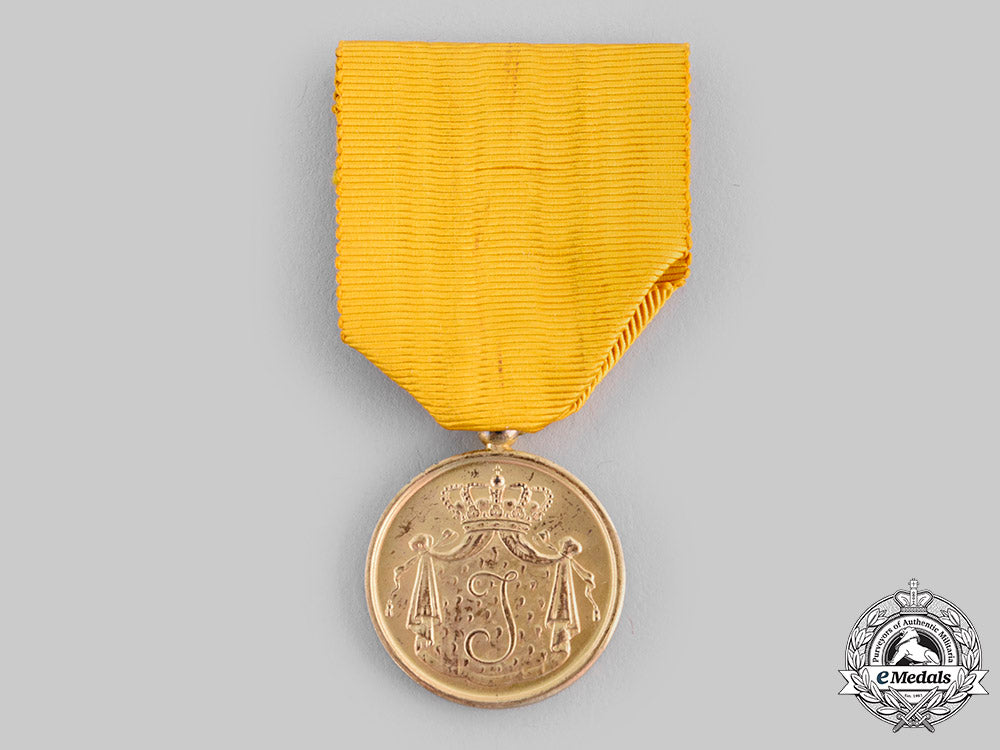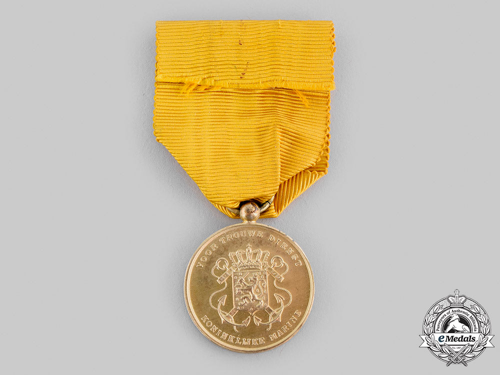 (Koninklijke Marine Medaille voor Trouwe Dienst). Instituted in 1845. Reduced Version, In bronze gilt, cypher of Queen Juliana on the reverse, measuring 27 mm in diameter, scattered gilt wear, original ribbon, near extremely fine.