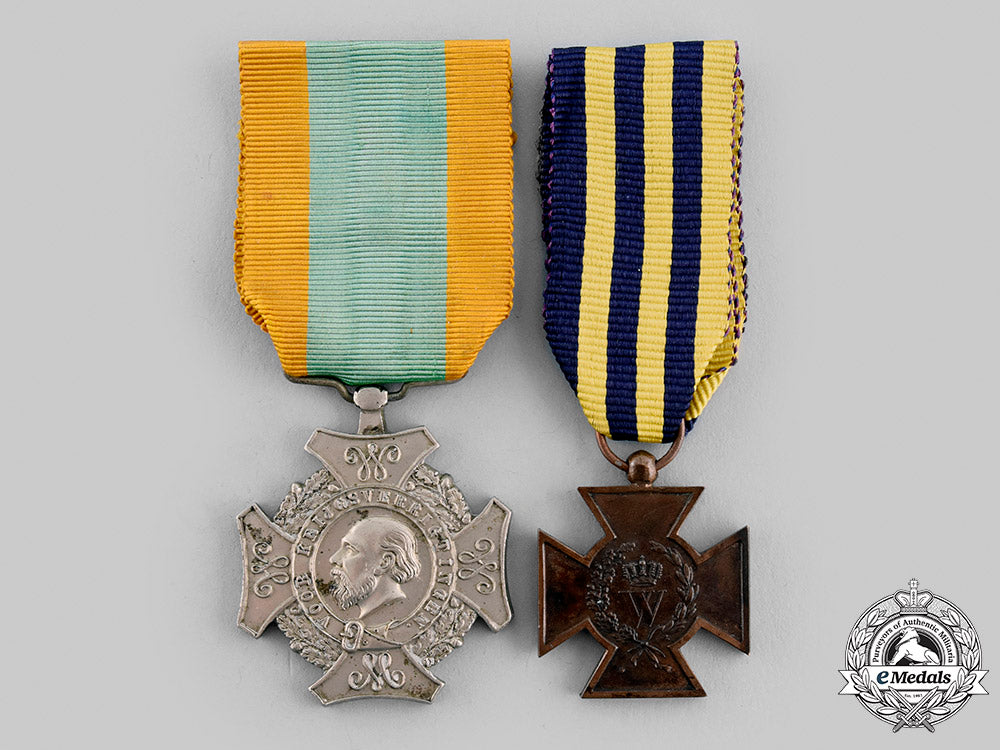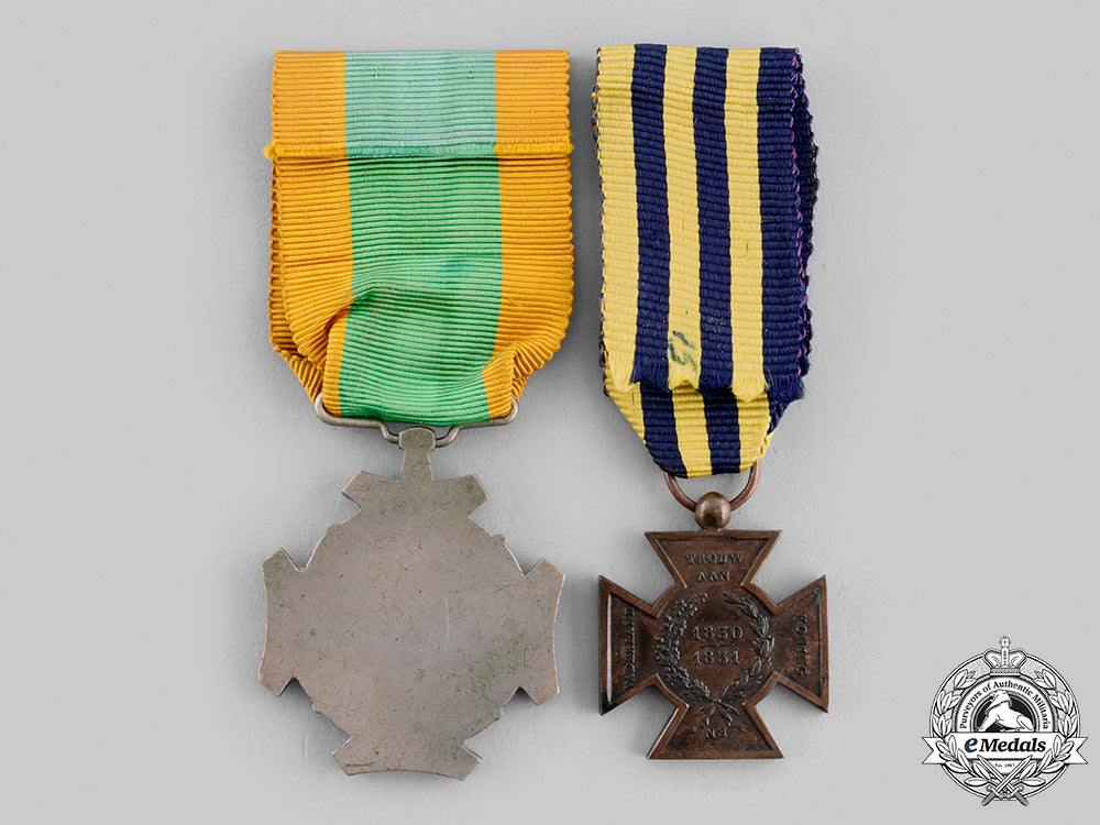 Hasselt Cross (AKA Metal Cross) 1830-1831 (Het Metalen Kruis 1830-1831). Instituted in 1831 (in bronze, measuring 29.3 mm (w) x 34.2 mm (h) inclusive of its laterally-pierced ball suspension, contact marks, original ribbon); and Cross for Important Military Operations (Ereteken voor Belangrijke Krijgsbedrijven) AKA Expedition Cross (Expeditiekruis). Instituted in 1869. In silvered fine zinc, measuring 38.8 mm (w) x 45 mm (h), spotting, contact marks, original ribbon). Together, very fine.