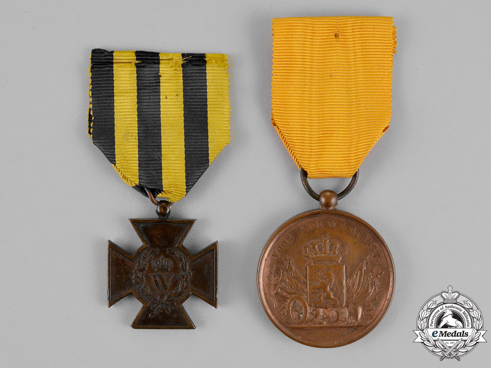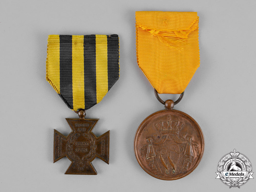 Hasselt Cross 1830-1831 (AKA Metal Cross): in bronze, measuring 29 mm (w) x 34 mm (h) inclusive of its ball suspension, original ribbon, contact marks and spotting; and Army Long Service Medal, Bronze Grade for Twelve Years' Service (Six in the Colonies): in bronze, measuring 37 mm, original ribbon, bruised. Together, very fine.