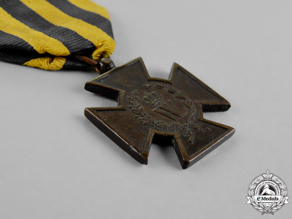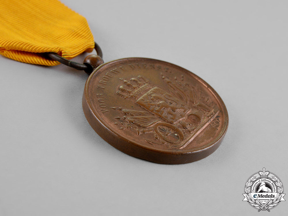 Footnote: The Hasselt Cross was instituted by Royal Order no. 70 on September 12, 1831 and awarded to participants in the war against Belgium of 1830-1831. Its official name is the Metalen Kruis (Metal Cross) but it is popularly known as the Hasselt Kruis (Hasselt Cross) since the bronze for the cross came from Belgian cannon captured during the Battle of Hasselt on August 8, 1831. At the Congress of Vienna in 1815, at which the Great Powers laid out the post-Napoleonic European map, Belgium became part of the new Kingdom of the Netherlands. However, the French-speaking Catholic elements of the population became increasingly disenchanted with the rule of the Dutch-speaking Protestant King Willem I and a rebellion started in Brussels in 1830. Belgian independence was declared and Dutch forces invaded but withdrew at the insistence of France and Britain. The independence of Belgium with Prince Leopold of Saxe-Coburg-Gotha as king was ratified at the London Conference of 1830-1831. The Army Long Service Medal was instituted on February 19, 1825 and was issued in three grades: Gold, Silver and Bronze.