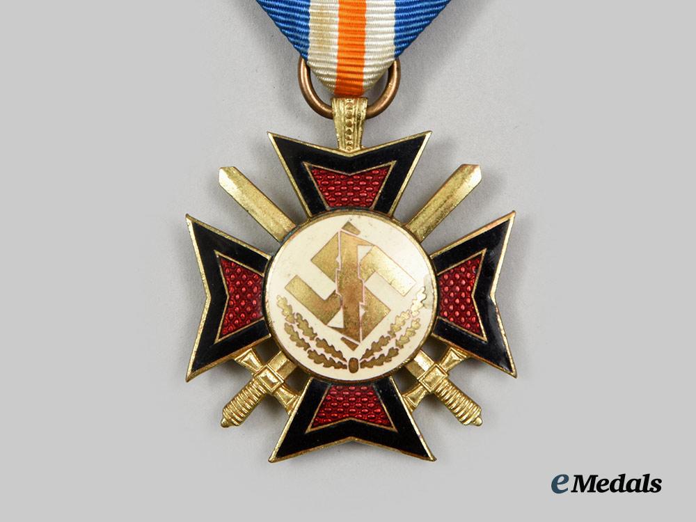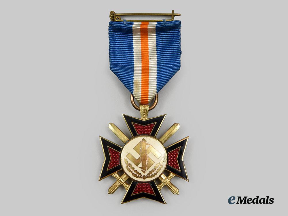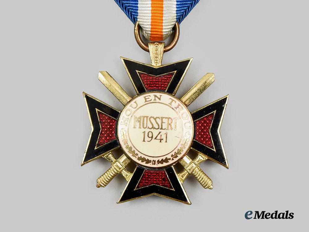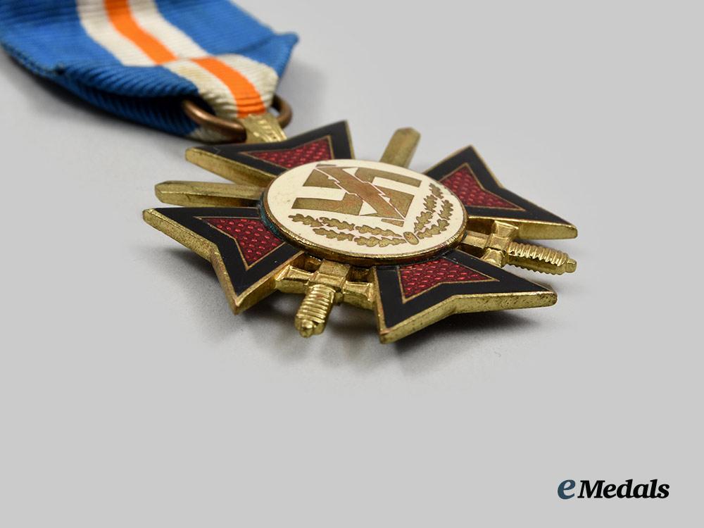 Constructed of gilded bronze with multi-coloured enamels, on loop for suspension from its period original ribbon with horizontal pinback, consisting of a Maltese Cross with crossed swords piercing the centrepiece and with double-sided red enameled arms trimmed with black, the obverse bearing a central white enameled medallion overlaid by a gilt mobile swastika, in turn defaced by a Wolfsangel, situated above oak leaf branches, the reverse bearing a central white medallion overlaid by a gilt inscription of “MUSSERT 1941”, topped by an inscription of “HOU EN TROU” (“STEADY AND TRUE”), situated above oak leaf branches, unmarked, measuring 37.78 mm (w) x 41.56 mm (h), weighing 25.2 grams (inclusive of ribbon), demonstrating flecking and scratching to the enamels, in near extremely fine condition.