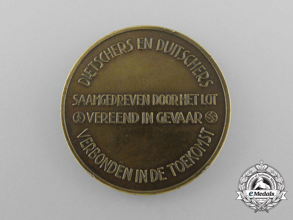 "Nationaal-Socialistische Beweging in Nederland". Bronze gilt, obverse illustrating the NSB wolfsengel fronting a swastika, framed by a flowering plant with a chain intertwined in the base of the plant and running from side to side, surrounded by the inscription "LOTSVERBONDENHEID 10-14 MEI 1940", reverse inscribed "SAAMGEDREVEN DOOR HET LOT / VEREEND IN GEVAAR" in the centre, inscribed "DIETSCHERS EN DUITSCHERS" above and "VERBONDEN IN DE TOEKOMST" below, 40 mm, edge nicks, scattered gilt wear, near extremely fine.