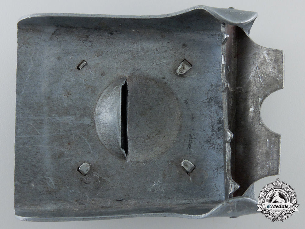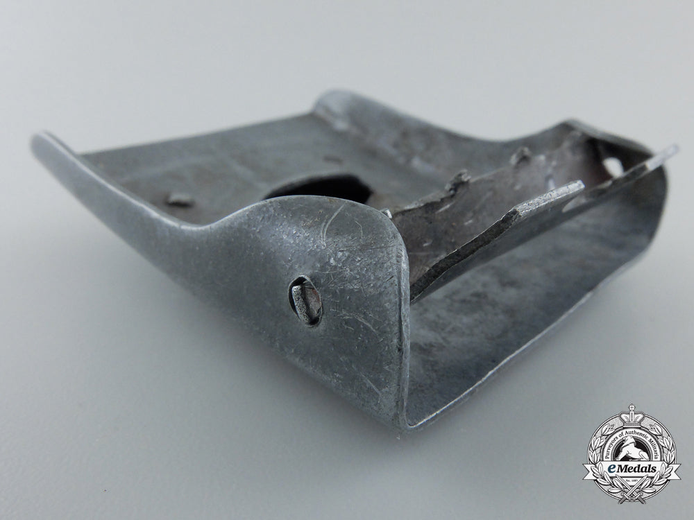 Two-piece construction, non-magnetic gray metal, unmarked, 51.3 mm x 64 mm, contact marks and surface wear, very fine. The Nationale Jeugdstorm (NJS) was a Dutch youth organization established in 1930s and active during the Second World War. This movement was inspired by the German Hitler Youth, and played a similar political/social role, but on a much smaller scale.