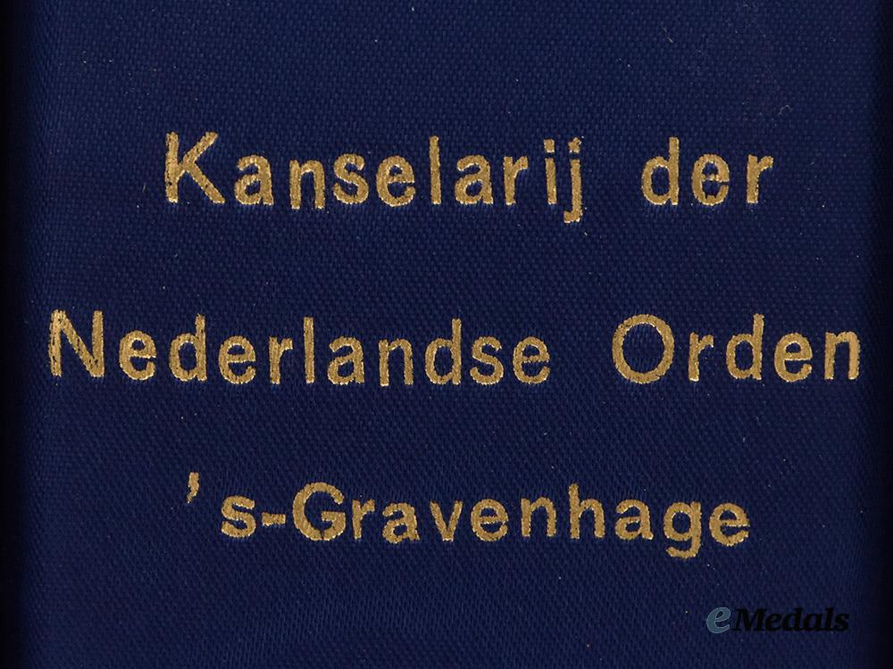 Contained in the original case of issue, blue leatherette, interior marked Kanselarij der Nederlandse Orden ‘s-Gravenhage, blue velvet medalbed, measures 65 mm (w) x 143 mm (h) x 22 mm (d), functional hinge and clasp, extremely fine.