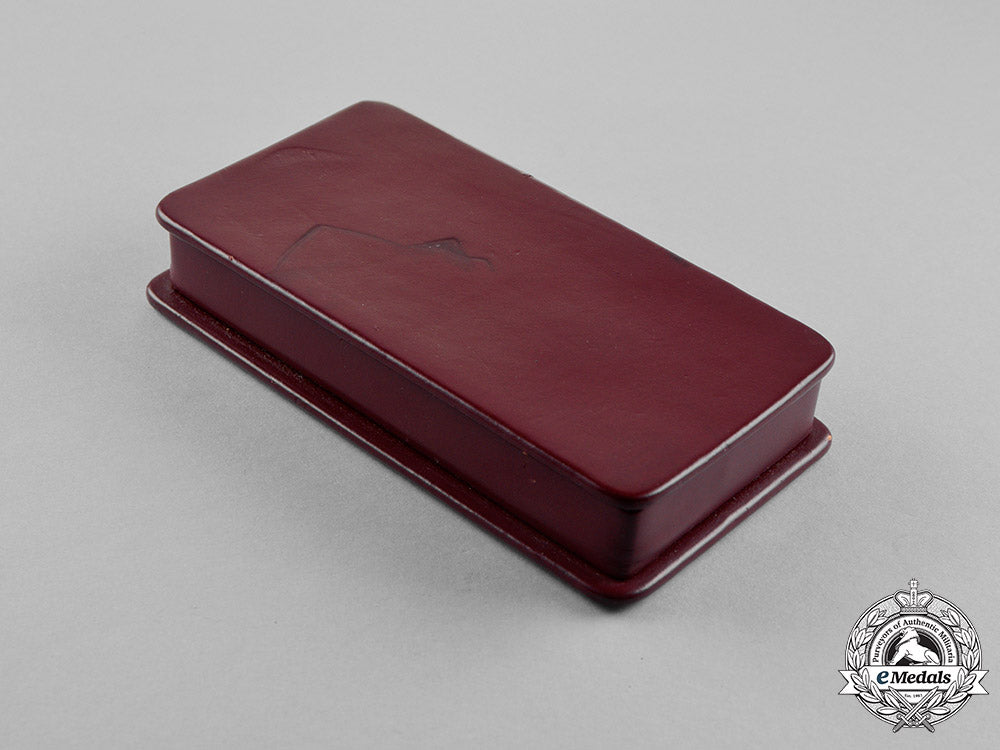 Instituted in 1980. In bronze gilt with red and white enamels, inscribed "PRL" in the centre, silvered centrepiece ring inscribed "ZASLUZONY DLA KULTURY POLSKIEJ" (For Meritorious Service to Polish Culture), measuring 32.3 mm x 37.7 mm (h), suspended from a 10.5 mm (w) x 37 mm (h) hanger in silvered bronze with orangey-red and white enamels and bearing the Polish eagle, the hanger with a vertical pinback, intact nemals, extremely fine. In its hardshelled case of issue, reddish-brown leatherette exterior, recessed medal bed, contact marks evident on the exterior, case better than very fine.