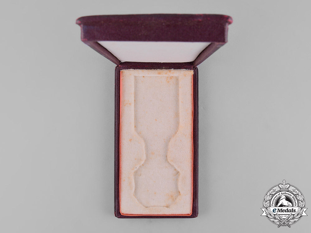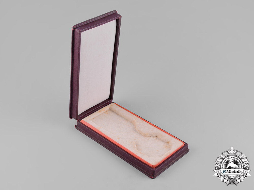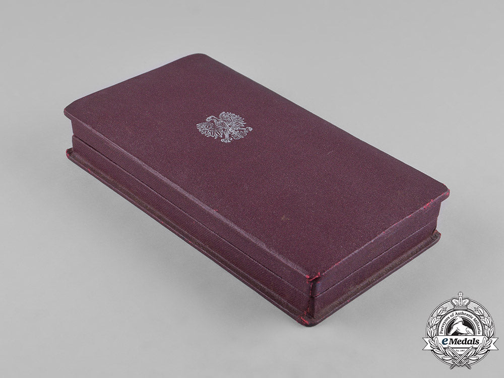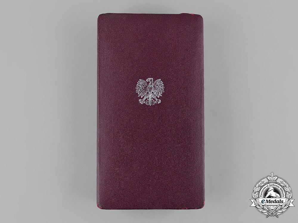 (Krzyz Zaslugi RP). Instituted in 1923. Hardshelled design on both the lid and base, the exterior with a maroon cloth fabric covering in an ornate interlocking pattern, the lid bearing the Polish Eagle in silver-coloured ink, inside lid lined in white satin and padded, a salmon-coloured synthetic insert placed within the base and housing a white felt recessed medal bed, designed without a secure closure, measuring 77 mm (w) x 142 mm (h) x 25.5 mm (d), very light edge wear evident on the exterior, light soiling present in the satin lining of the inside lid and the white felt of the medal bed, very fine.