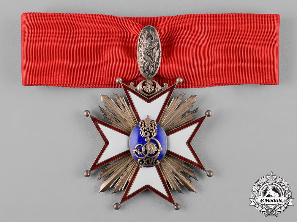 Instituted 1921 by Pope Benedict VX. In silver gilt with red, white and blue enamels, composed of a Maltese cross with multiple emanating rays between each arm, the obverse oval centrepiece with the monogram of Pope Benedict affixed, reverse oval centrepiece illustrating a man kneeling before Jesus Christ and framed by a wreath of laurel leaves, ornate integral suspension, measuring 66.5 mm (w) x 71.2 mm (h), measuring 94 mm (h) inclusive of its ornate elongated suspension loop which bears laurel leaves, tiny chip evident in the red enamels on the tip of the upper point on the arm at 9 o'clock, otherwise the enamels are intact, both ball finials on the same arm are bent back slightly, replacement modern neck ribbon, near extremely fine.