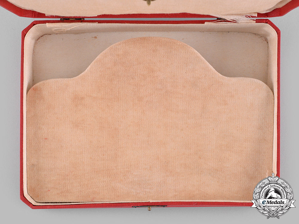(Order Odrodzenia Polski). Instituted in 1921. Hardshelled design on both the lid and base, with distinctive angled corners, wooden-framed, the exterior with a red thatched-look cloth covering on five sides, the bottom with a red pebbled paper covering, the lid bearing the crowned Polish eagle surrounded by the inscription "POLONIA RESTITVTA" in gold-coloured ink, the sides trimmed in two thin gold-coloured rules, one on the lid and one on the base, inside lid lined in white satin-like cotton and padded, a white fabric-wrapped cardboard insert placed within the base and incorporating a raised platform in off-white felt for the awards, dual-hinged, single clasp closure, measuring 231 mm (w) x 167 mm (h) x 63.5 mm (d), wear and scuffing evident in the paper covering on the bottom, wear in the fabric overlying the hinged area, soiling present on the off-white felt on the raised platform, very fine.
