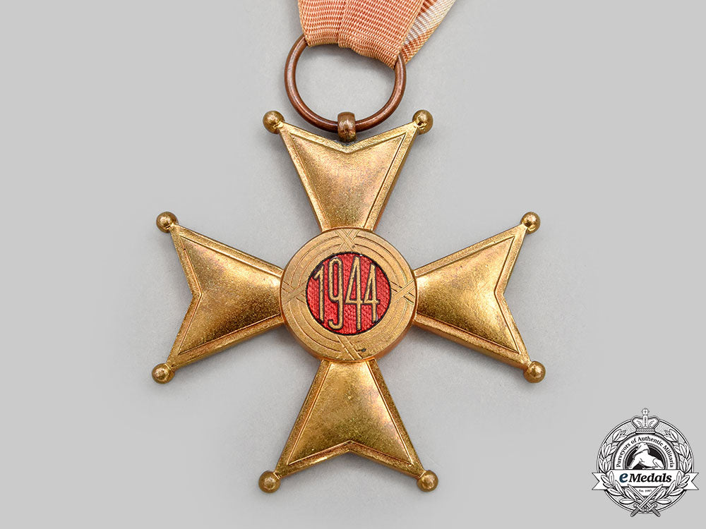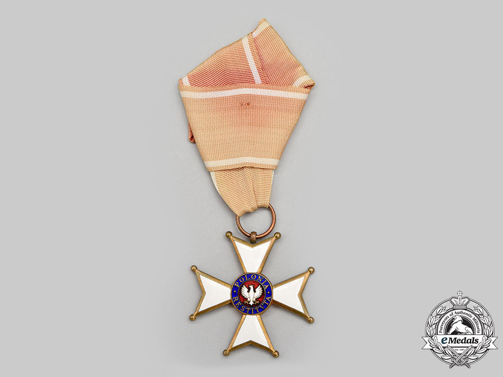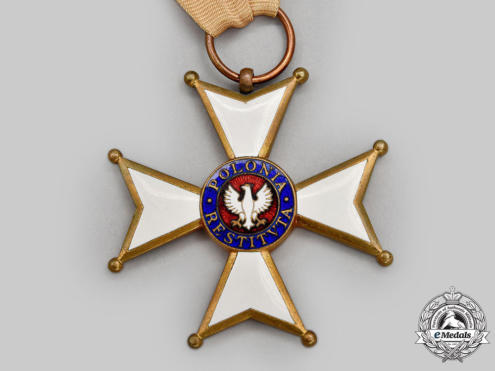 (Order Odrodzenia Polski). Instituted in 1921. Type II (1944). In bronze gilt with red, white and blue enamels, measuring 62 mm (w) x 62 mm (h), on its original full-length neatly folded and lightly sunned neck ribbon, intact enamels, very light contact, near extremely fine.