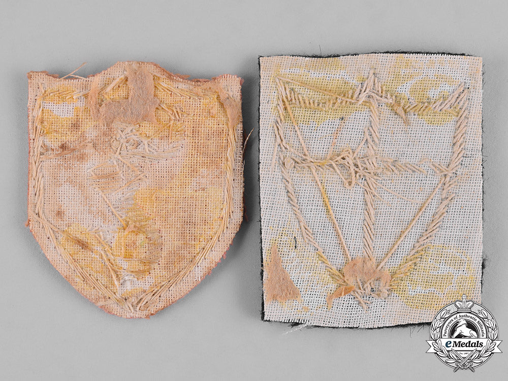 2nd Polish Army Corps, Officer's Sleeve Badge (in white and gray embroidery, on a red felt base, white cotton mesh backer, measuring 40 mm (w) x 49 mm (h)); and British 8th Army Sleeve Badge (which was worn by all ranks after the Battle of Monte Cassino, two-piece construction, white cotton shield with the cross in rolled gold-coloured bullion wire, the outer framework of the shield in rolled silvered bullion wire, the shield sewn in place to a rectangular-shaped black felt base, white cotton mesh backer, measuring 41 mm (w) x 50 mm (h)). Paper and glue residue evident on the reverse of both badges from previous board mounting, near extremely fine.