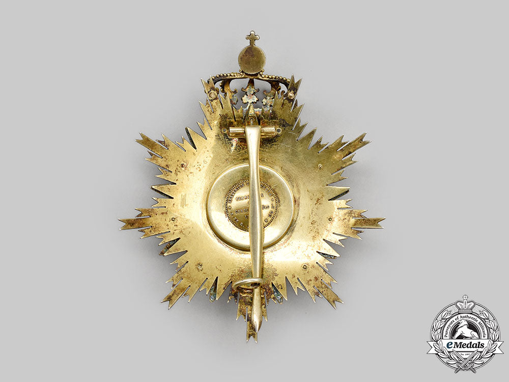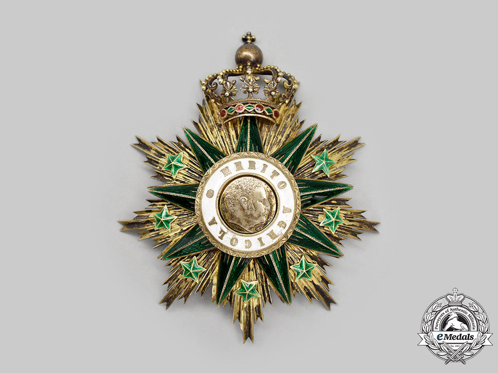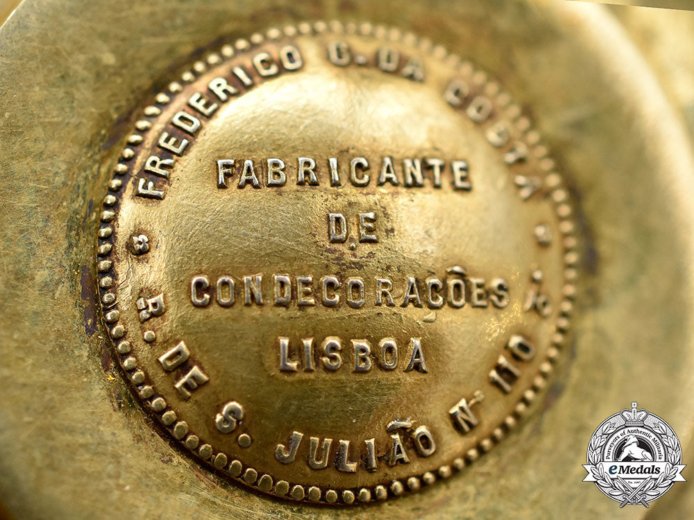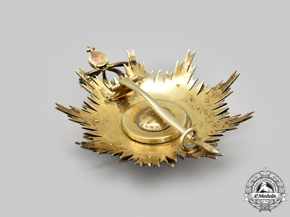 (Ordem do Mérito Agrícola). Instituted in 1893. Type I (1893-1910). Insignia in silver gilt with white and green enamels, with seven stars in silver gilt and green enamels placed between the star points on the insignia, surmounted by a crown in silver with seven alternating red and green enamelled jewels in its base, mounted to a silver nine-pointed star base, each star point with five emanating rays, with a single emanating ray between each star point, maker marked "FREDERICO G. DA COSTA / R. DE S. JULIÃO Nº 110 3º / FABRICANTE DE CONDECORAÇÔNES LISBOA" on the reverse cartouche, measuring 76.3 mm (w) x 90.8 mm (h), vertical pinback, the centrepiece ring having been turned ninety degrees counter-clockwise versus its original position, the ring itself exhibits chipping, crazing and repair in the white enamels around "AGRICOLA", otherwise the enamels are intact, near extremely fine.