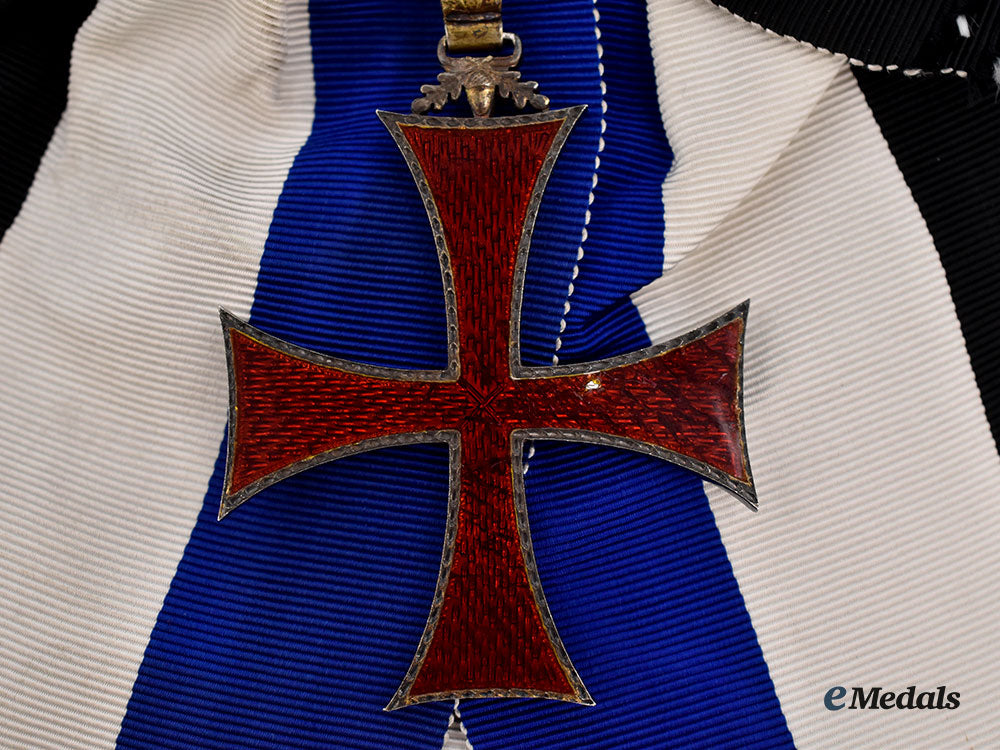 (Ordem do Infante Dom Henrique, o Navegador). Instituted in 1960. In silver with red enamels, hallmarked on the reverse of the silver gilt loop, measuring 56.8 mm (w) x 72 mm (h) inclusive of its integral suspension, tiny chip evident in the red enamels on the arm at 3 o'clock, along with crazing present on the arms at 3 and 6 o'clock, on its full-length sash that incorporates a decorative moiré pattern and features a large bow-tie, near very fine.