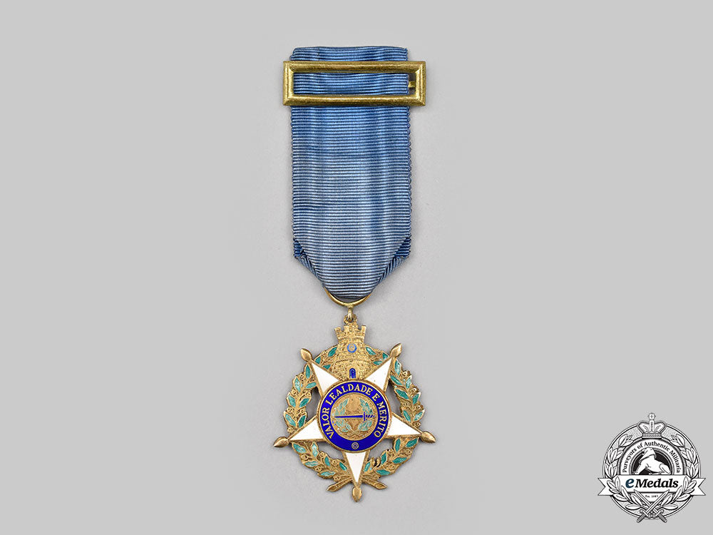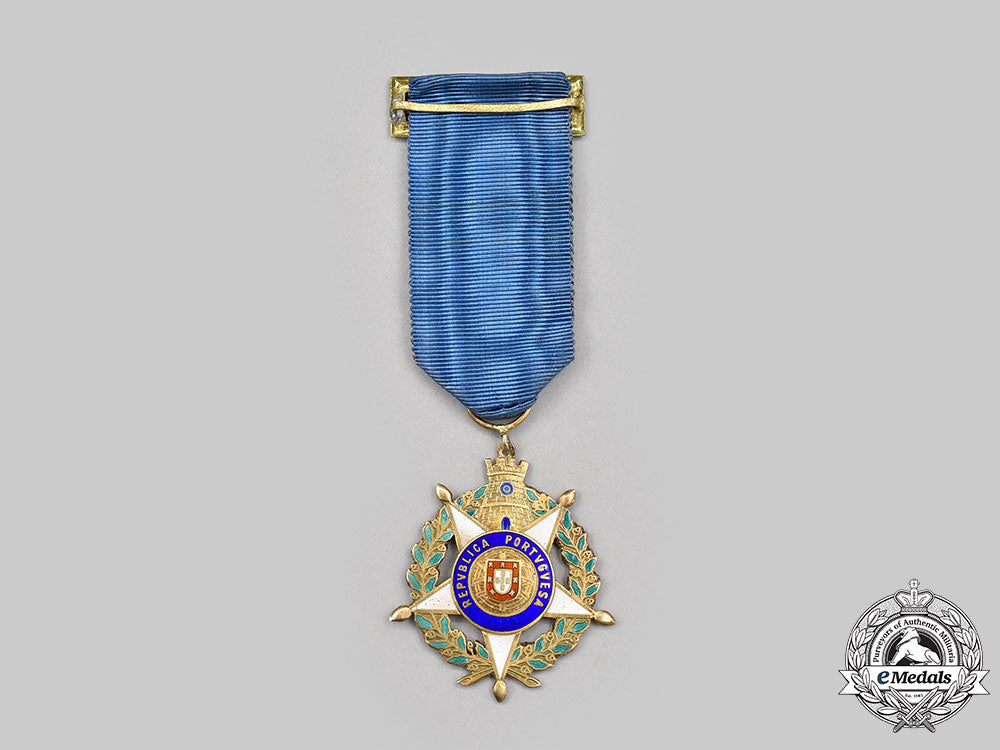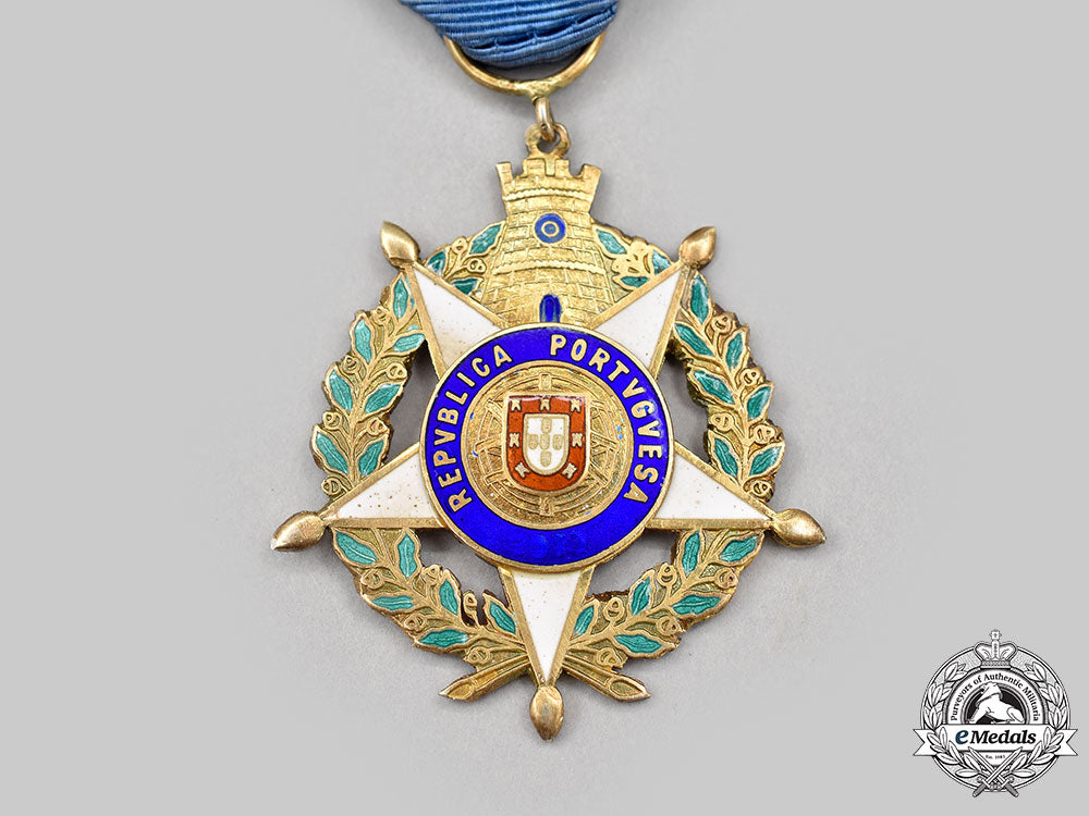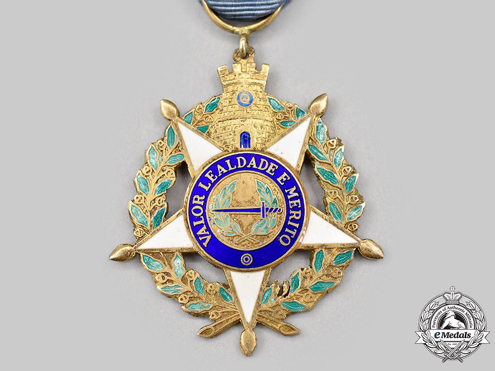 (Ordem Militar da Torre e Espada). Instituted in 1549, revived in 1808, discontinued in 1910. Three-piece construction, in silver gilt with red, blue, white and green enamels, measuring 41.7 mm (w) x 48 mm (h) inclusive of its integral ring, tiny chip evident in the white enamels on the tip of the arm at 6 o'clock on the obverse, otherwise the enamels are intact, traditional horizontal clasp affixed to its original ribbon, near extremely fine.