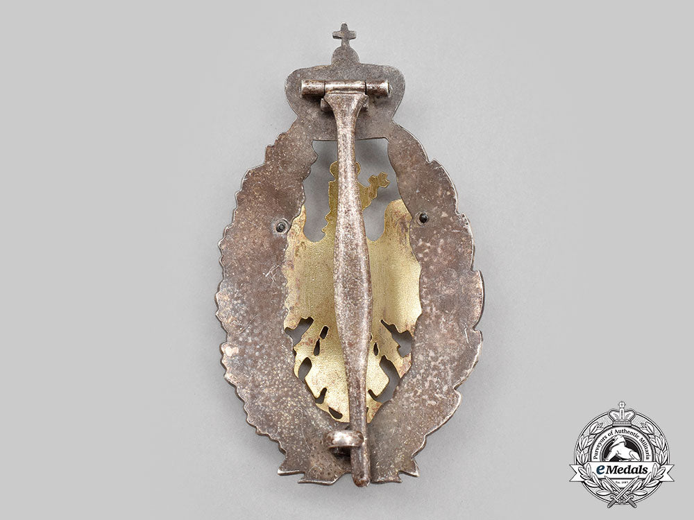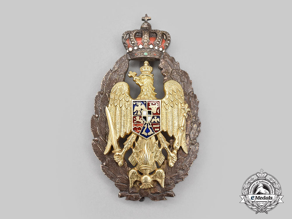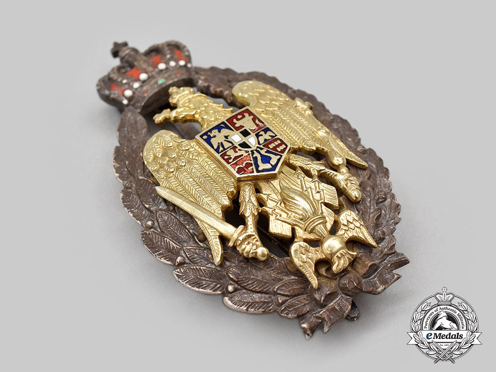 Three-piece construction, insignia in silver gilt with red, white, blue and black enamels, mounted to a base in silver with red, white and green enamels, the insignia illustrating an eagle with the Romanian coat-of-arms on its chest, backed by an open-ended wreath of laurel leaves and oak leaves and surmounted by the Royal crown, unmarked, measuring 53 mm (w) x 56 mm (h), vertical pinback, intact enamels, extremely fine.