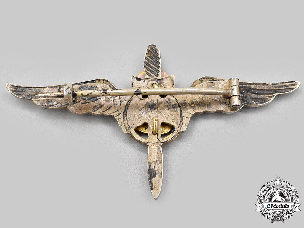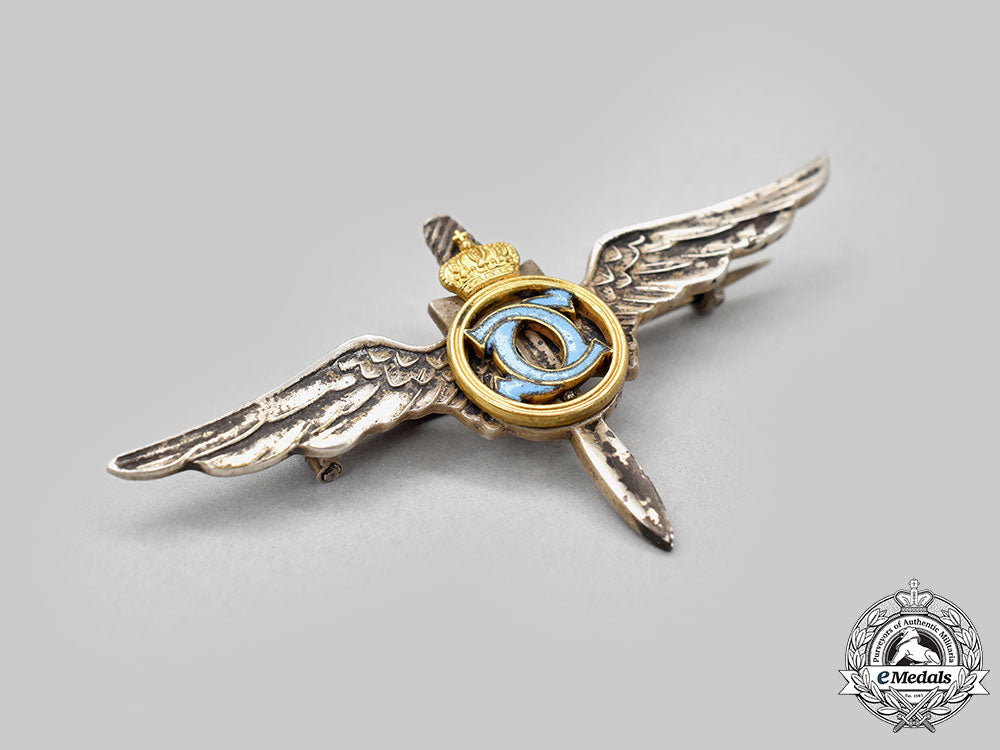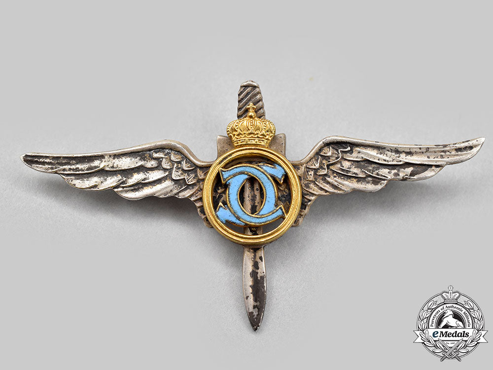 (Forțele Aeriene Românei). Insignia in bronze gilt with azure blue enamels and bearing the monogram of King Carol II, mounted to a frosted silver propeller and wings base, unmarked, measuring 66 mm (h) x 35.5 mm (h), horizontal pinback, pitting evident in the azure blue enamels, scattered silvering wear on the propeller and the wings, very light contact, better than very fine.