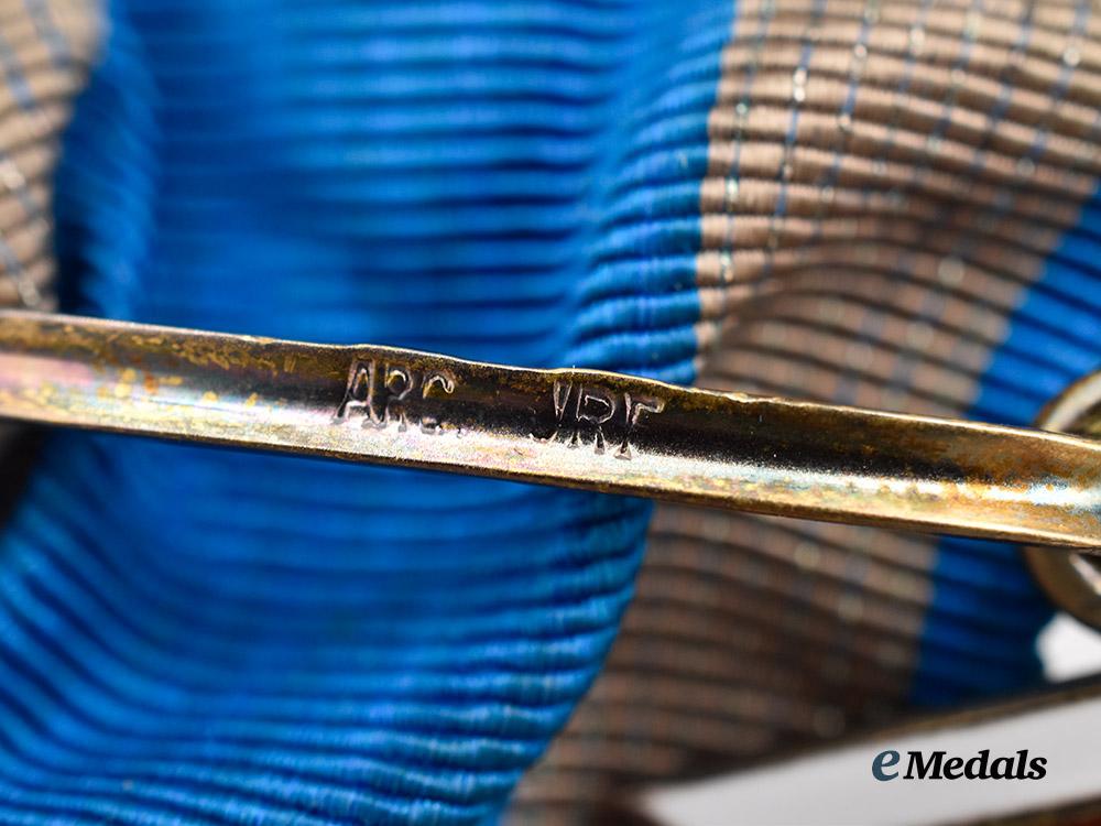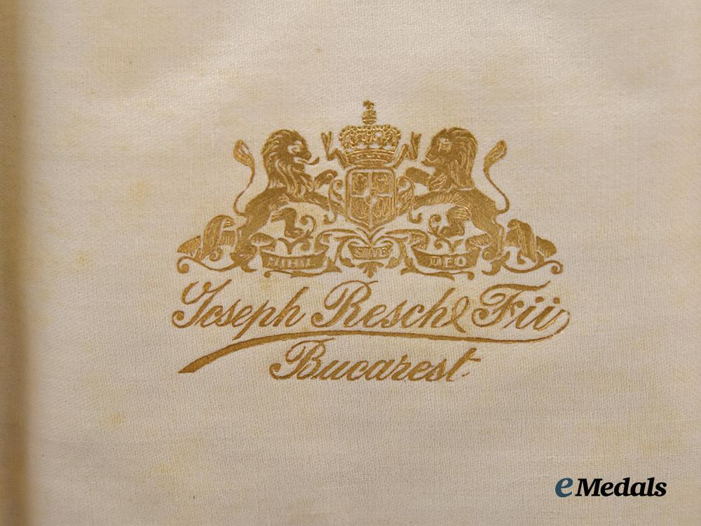 In the original case of issue, a blue leatherette exterior with Romanian cypher on the lid, interior lid marked Joseph Resch Fils Bucarest, grey velvet medalbed, measures 110 mm (w) x 235 mm (l) x 40 mm (d), catch slightly off center, minor wear and fatigue to the exterior, silk covering hinge on the interior ripped, in very fine condition.