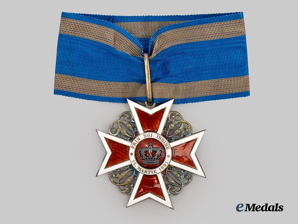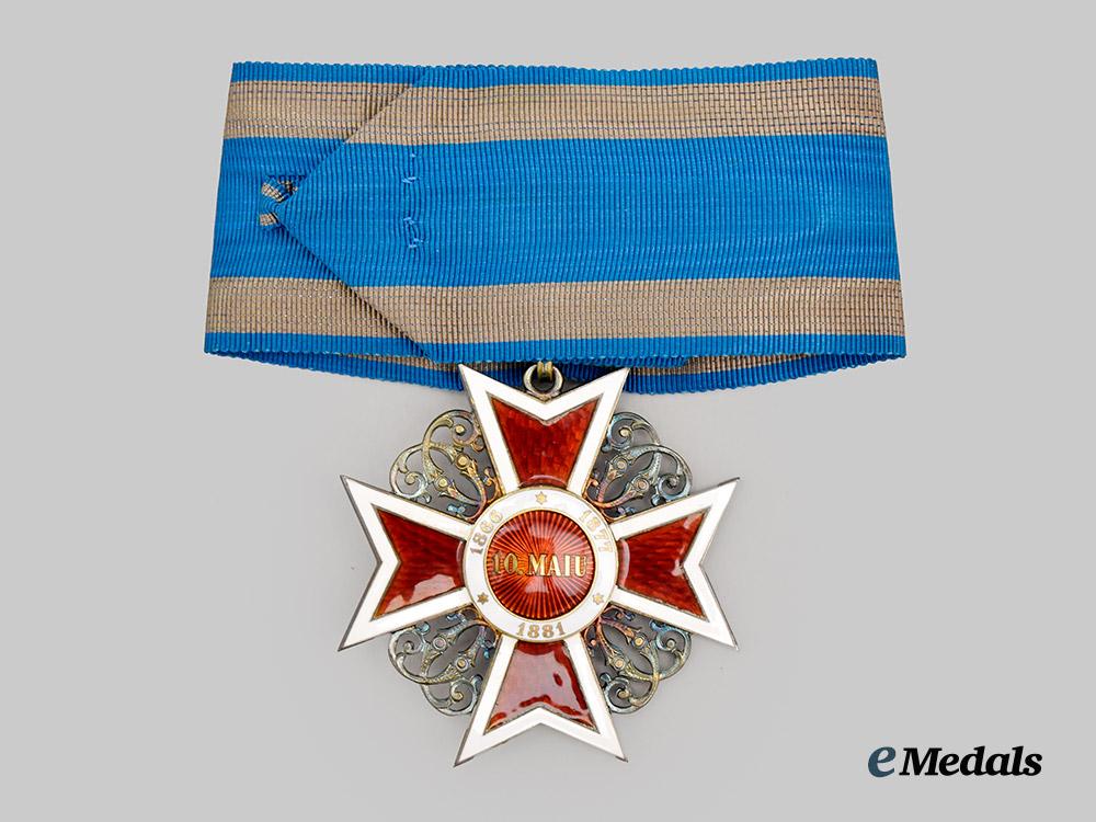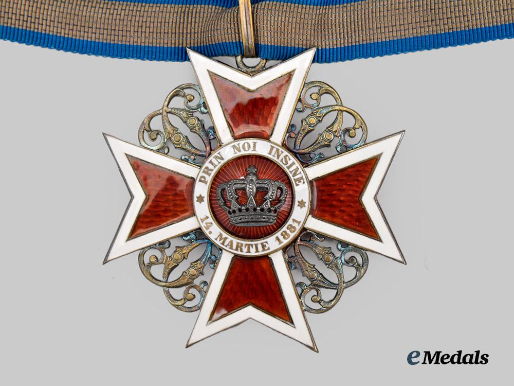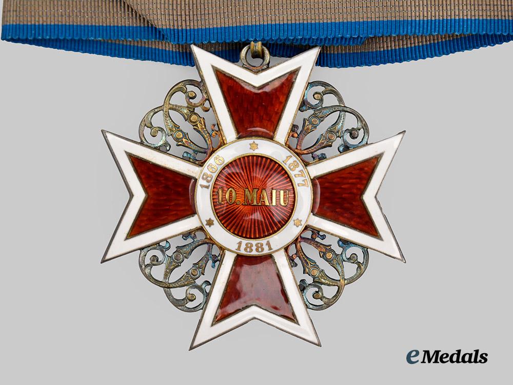 (Ordin "Corona Romaniei"). Instituted in 1881. Type I (1881-1932 Issue). A Grand Officer’s Set comprising a neck badge, in silver gilt, a red and white enamelled Maltese Cross with C cyphers in each quadrant, the obverse medallion presents a crown with the inscription PRIN NOI INSINE14. MARTIE 1881, the reverse medallion bears the days 10.MAIU 1866 1877 1881, measures 62.08 mm (w) x 63.86 mm (h), reverse of the elongated loop marked ARG denoting silver, and JRF denoting manufacture of Joseph Resch Fils, enamels intact, gilt wear, near mint condition.