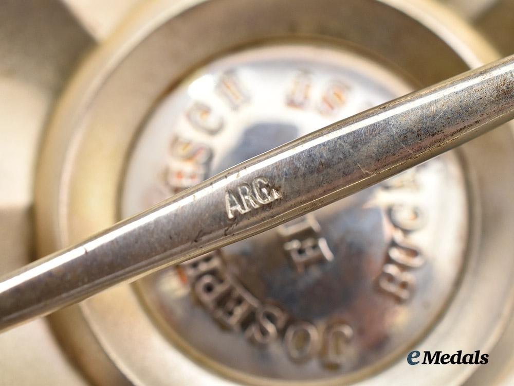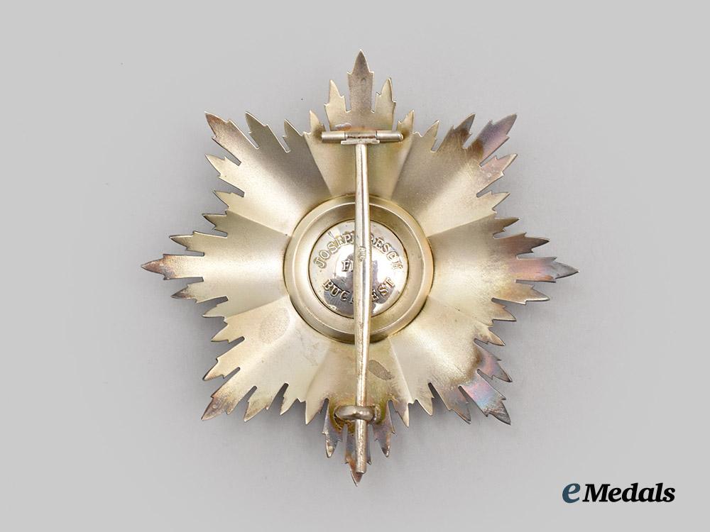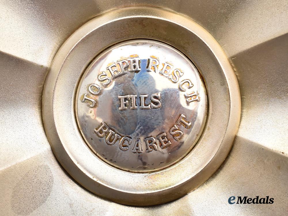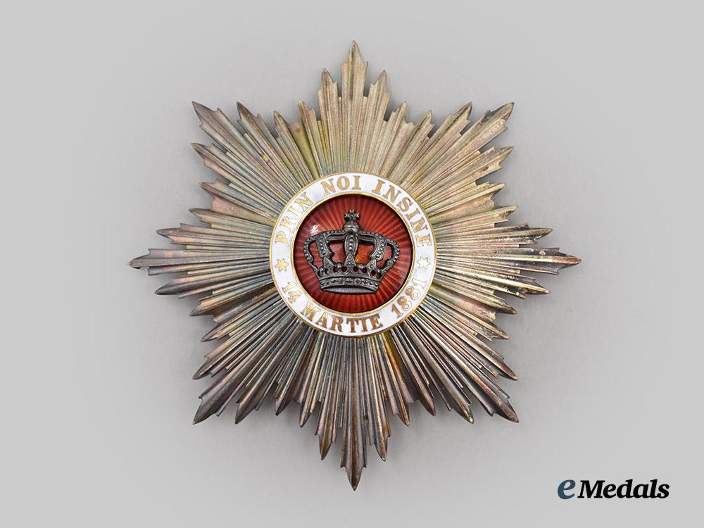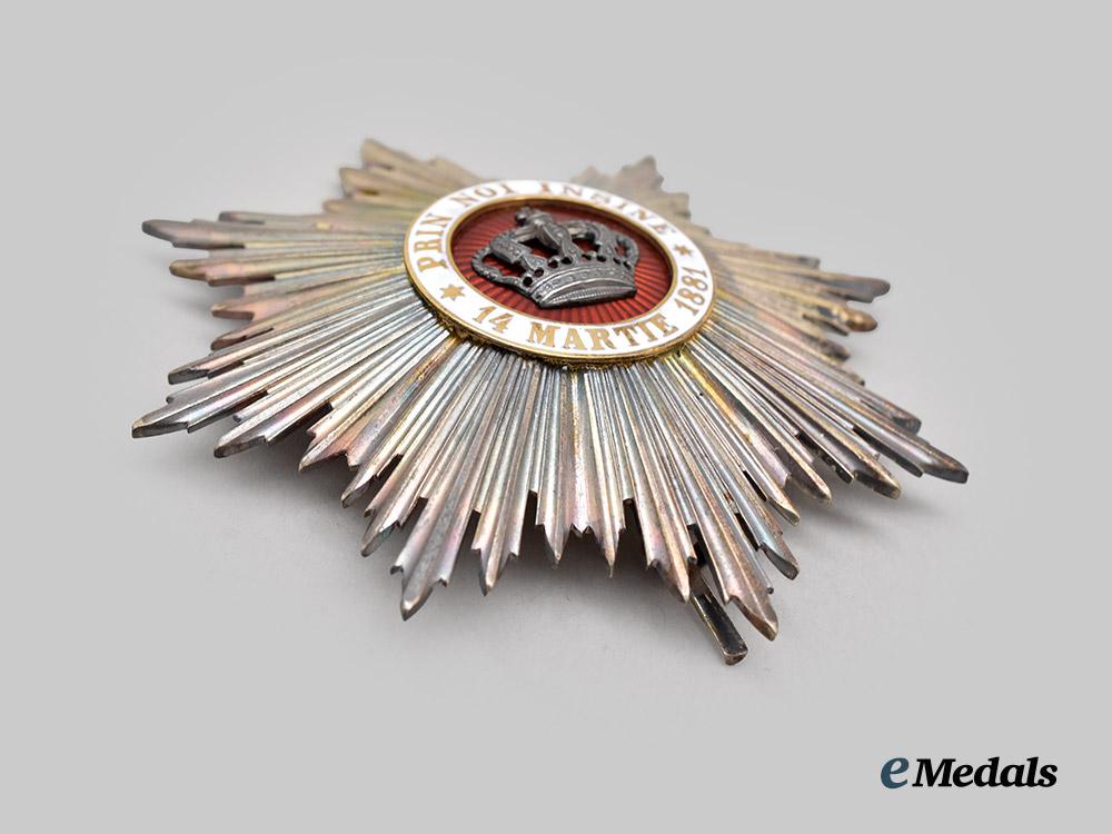The Star of the Order, in silver, an eight point star with clusters of silver rays, the obverse medallion features a crown on a red enamelled field, surrounded by a white ring inscribed PRIN NOI INSINE 14 MARTIE 1881, reverse features a vertical pin assembly, central cartouche identified the maker JOSEPH RESCH & FIU BUCAREST, pin marked ARG denoting silver fineness, measures 83.2 mm (w) x 82.8 mm (h), enamels intact, in extremely fine condition.
