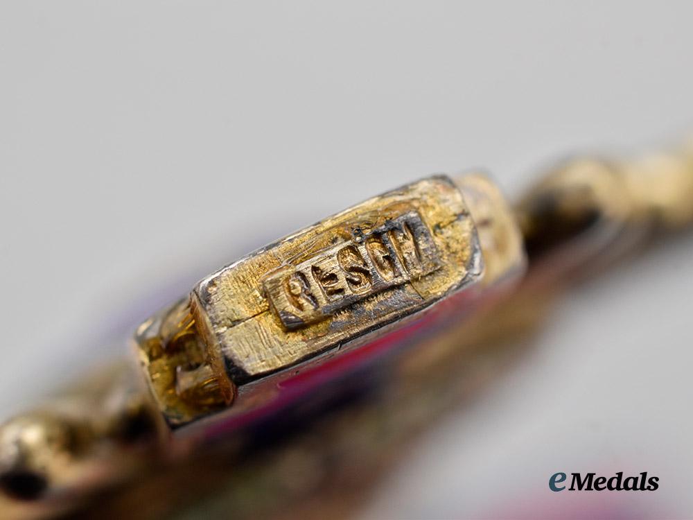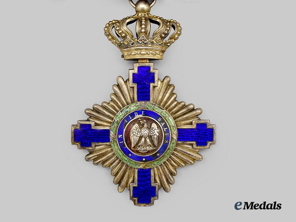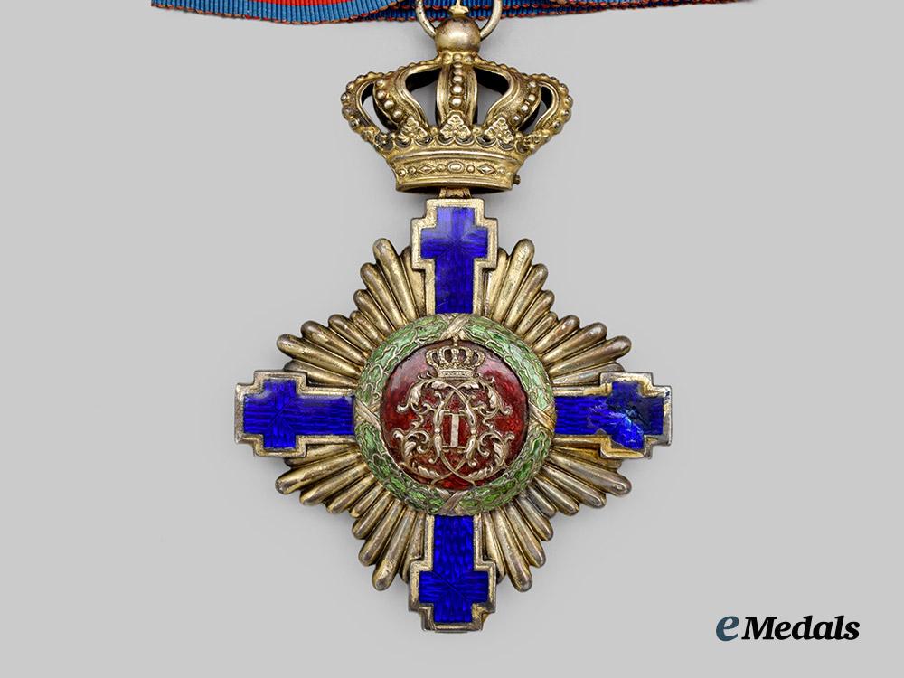 Instituted on May 10, 1877. A Commander neck badge in silver with a blue enamel cross with a cluster smooth rays in each quadrant, the obverse medallion features a superimposed eagle on a red enamelled field, surrounded by a blue enamel ring inscribed IN FIDE SALUS, encircled by a green enamelled wreath, the reverse bears the crowned monogram of King Carol I, the cross is surmounted by a large crown, measures 65.6 mm (w) x 96.5 mm (h - inclusive of crown suspension), base of 6 o’clock arm is marked RESCH, accompanied by an original neck ribbon (missing ties at the each end), enamel damage to the obverse medallions and reverse 3 o’clock arm, demonstrating gilt wear throughout, remains in extremely fine condition.
