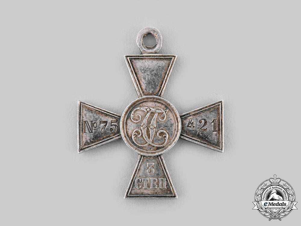 Footnote: The St. George Cross was established in a February 1807 decree of Emperor Alexander I, intended as a reward for "undaunted courage" by the lower ranks (soldiers, sailors and NCOs) of the military. On September 10, 1916, the Highest Council of Ministers approved a change to the St George Cross, removing the gold and silver from its making. They began to mint crosses made of "yellow metal" (JM) and of "white metal" (BM). The numbering on the III Class crosses from the period 1913-1915 range from 1 to 289150.