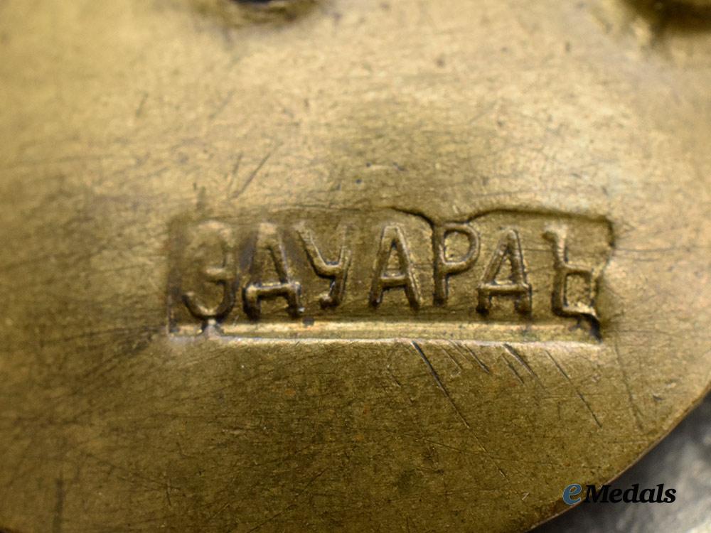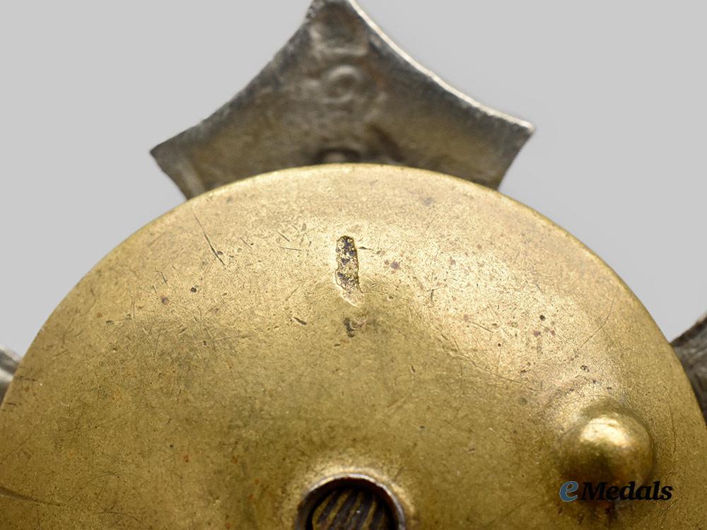 Instituted May 15, 1912. In bronze and white metal, a cross featuring Royal Russian monograms on the 12 and 6 o’clock arm, with the dates 1769 and 1869 on the 9 and 3 o’clock arms respectively, the center medallion features the coat of arms of Tula with the inscription of Emperor Nicholas under the crown, the reverse presents a single screwpost with a screw plate marked Eduard, measures 44.48 mm (w) x 45.37 mm (h), light wear, a rare badge in very fine condition.