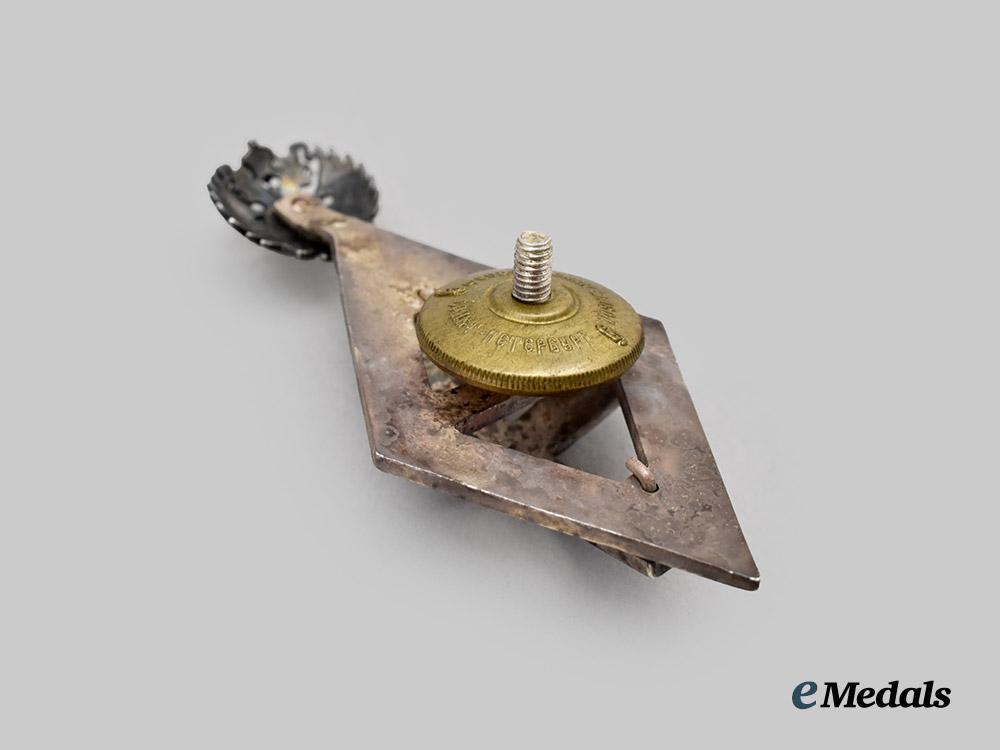 In silver and enamels, obverse featuring a blue-enamelled cross topped by Imperial eagle, reverse screw pinback, maker mark, evidence of wear on obverse white enamel, 59.6 mm (h) x 27.5 mm (w), makers marked on screw plate, very fine.