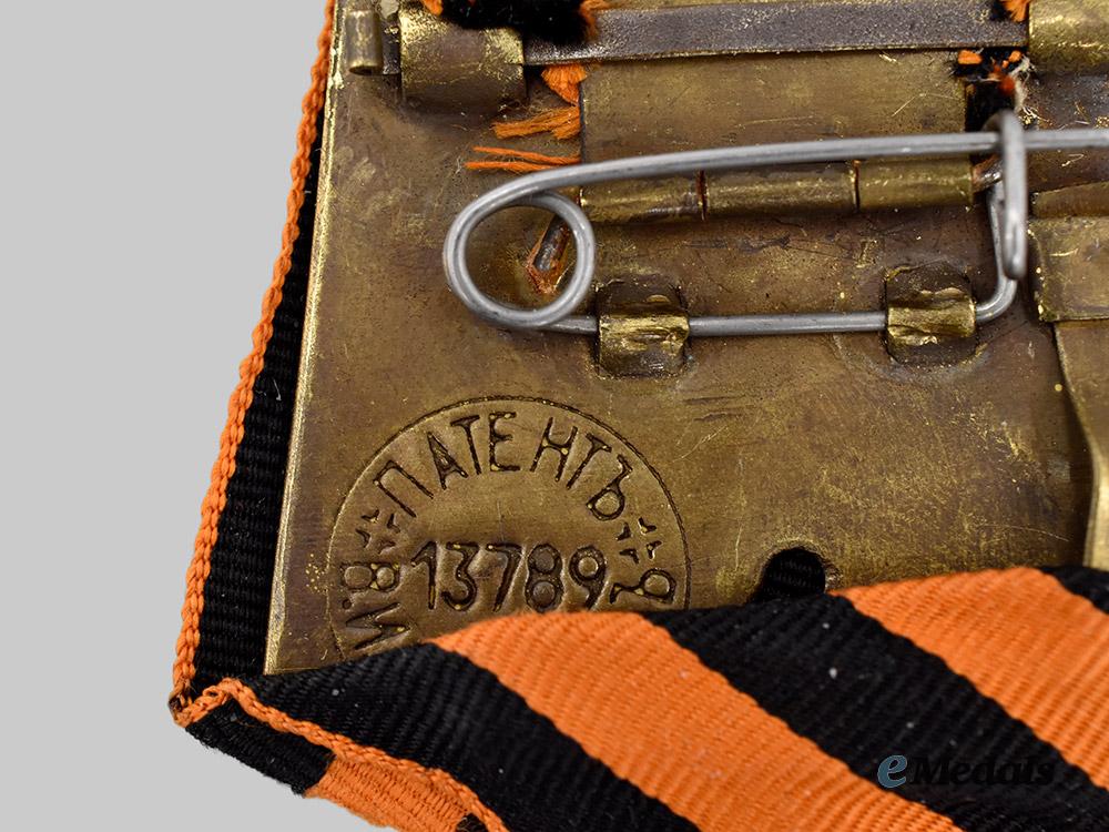 (Георгиевский крест, 3-й степени). Instituted February 1807 by Tsar Alexander I. A silver cross pattee, the obverse bearing Saint George on horseback slaying a dragon, the reverse bears the central cypher of the saint, the reverse of the 9 and 3 o'clock arms are numbered 46557, measures 33.8mm (w) x 41.3 mm (h), worn on a Russian pentagonal mount with the overlaid ribbon and pin fixtures on reverse, notable contact marks, very fine.