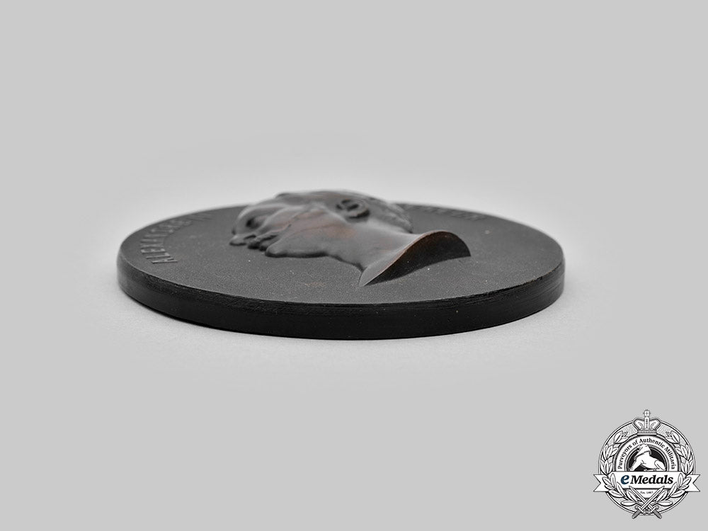 A unique French-made Tsar Alexander II commemorative plaque, constructed of Bois Durci, the obverse bearing a raised leftward-facing profile of the Tsar, circumscribed by name and title, the reverse bearing a raised inscription of “BOIS DURCI”, topped by a stud with a wire suspension loop, measuring 114 mm in diameter, in near extremely fine condition.
