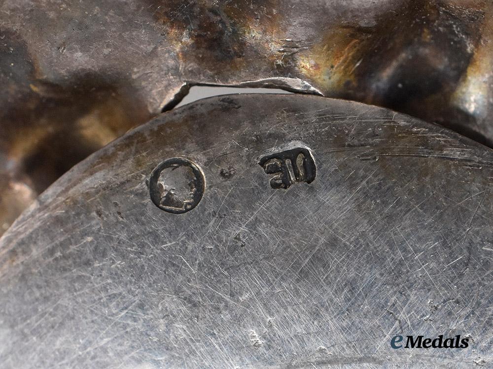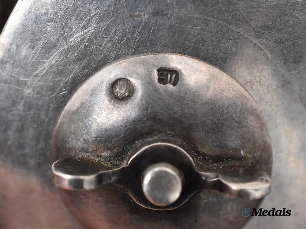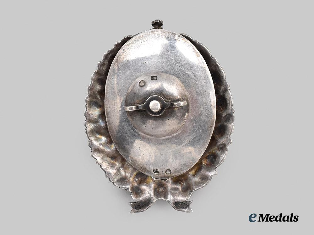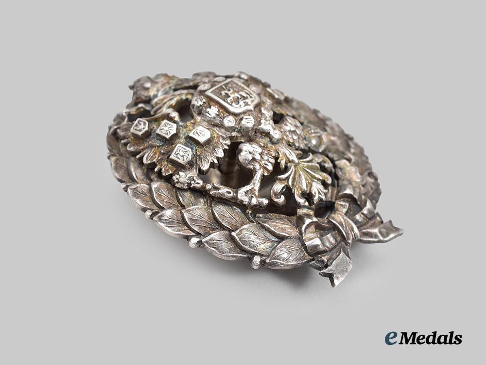 Instituted June 14, 1866. In silver, a large convex badge presenting the national emblem encircled in a wreath of oak and laurel leaves, reverse bearing a long singular screwpost, marked zolotnik mark 84 indicated 875 silver content, maker mark ЛЭ at 6 o’clock, inclusive of the backplate and screwplate, both marked ЛЭ and bear a kokoshnik, measures 46.38mm (w) x 59.35 mm (h), weighs 43.45 grams, dark patina, in extremely fine condition.