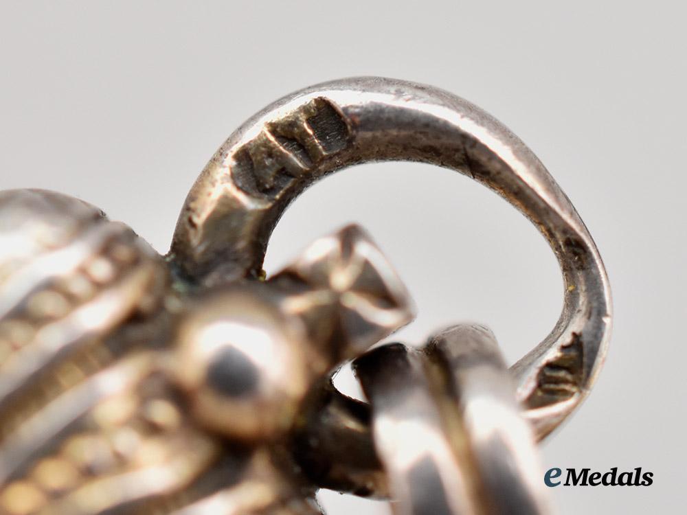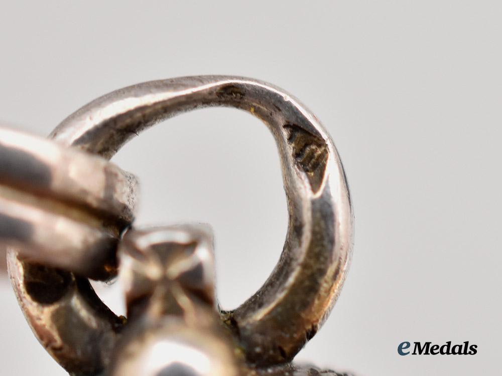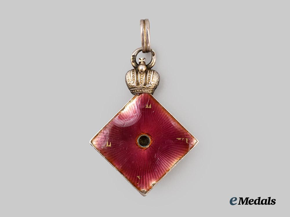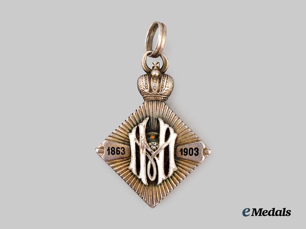 In silver and enamels, the obverse in a purple enamel missing the central medallion (should be a superimposed crossed), the reverse bearing an MN monogram of the recipient with the dates 1863 1903, marked AT on the ring denoting Alexander Tillander manufacture, measures 31.0 mm (w) x 42.1 mm (h), enamel chip to obverse cypher, and heavy damage to reverse, better than fine.