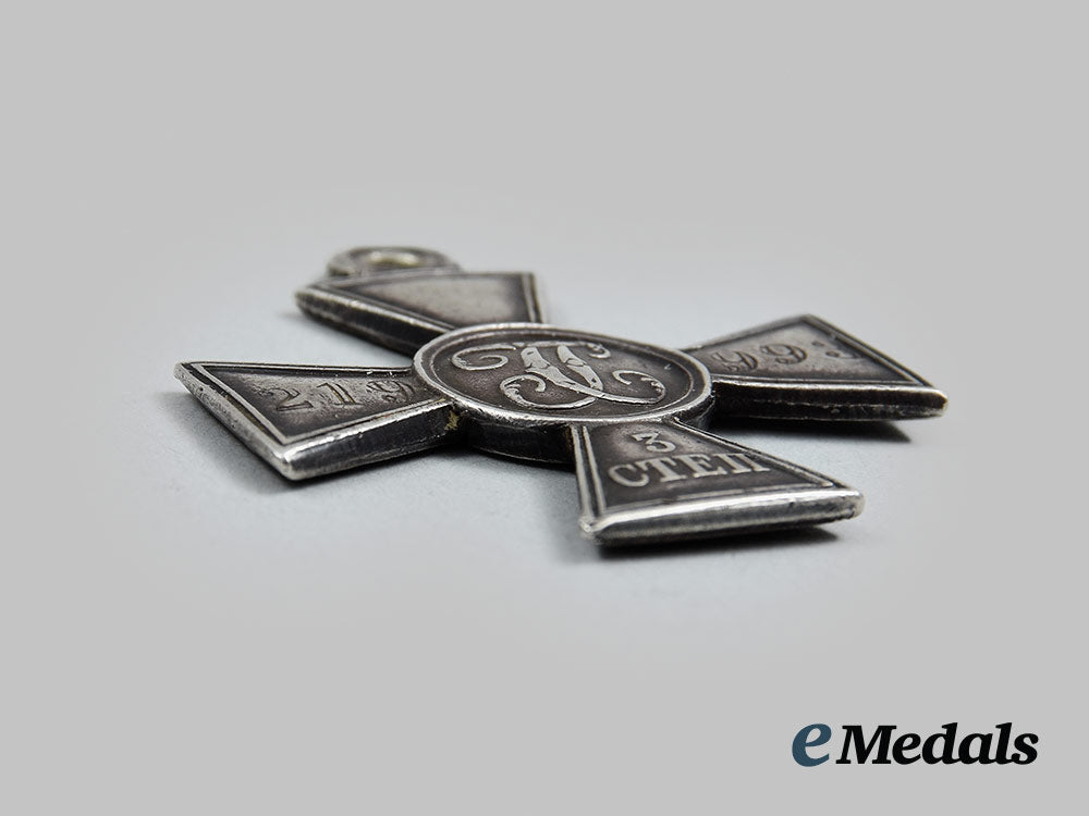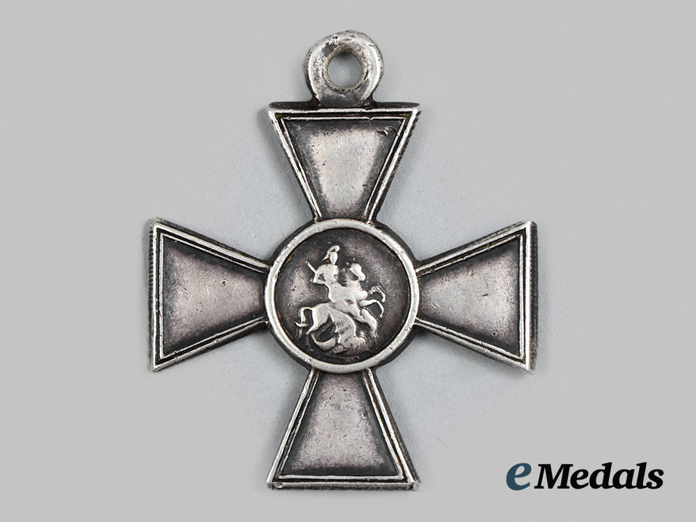 (Георгиевский крест, 3-й степени). Instituted February 1807 by Tsar Alexander I. (1807-1917 issue). Constructed of silver, consisting of a Cross Pattée with ribbed arms, the obverse bearing a central raised depiction of St. George slaying a dragon, the reverse bearing a central raised disc with Cyrillic characters “СГ” (SG) as the saint’s monogram, the three and nine o’clock arms etched with a number of “219993”, the six o’clock arm bearing an inscription of “3 СТЕП” (3RD CLASS), the twelve o’clock arm with an integral loop connecting to a suspension ring with a pentagonal backplate and period original ribbon, unmarked, measures 35.5mm (w) x 40.9mm (h), weighs 11.3 grams, light wear, lovely patina, in near extremely fine condition.