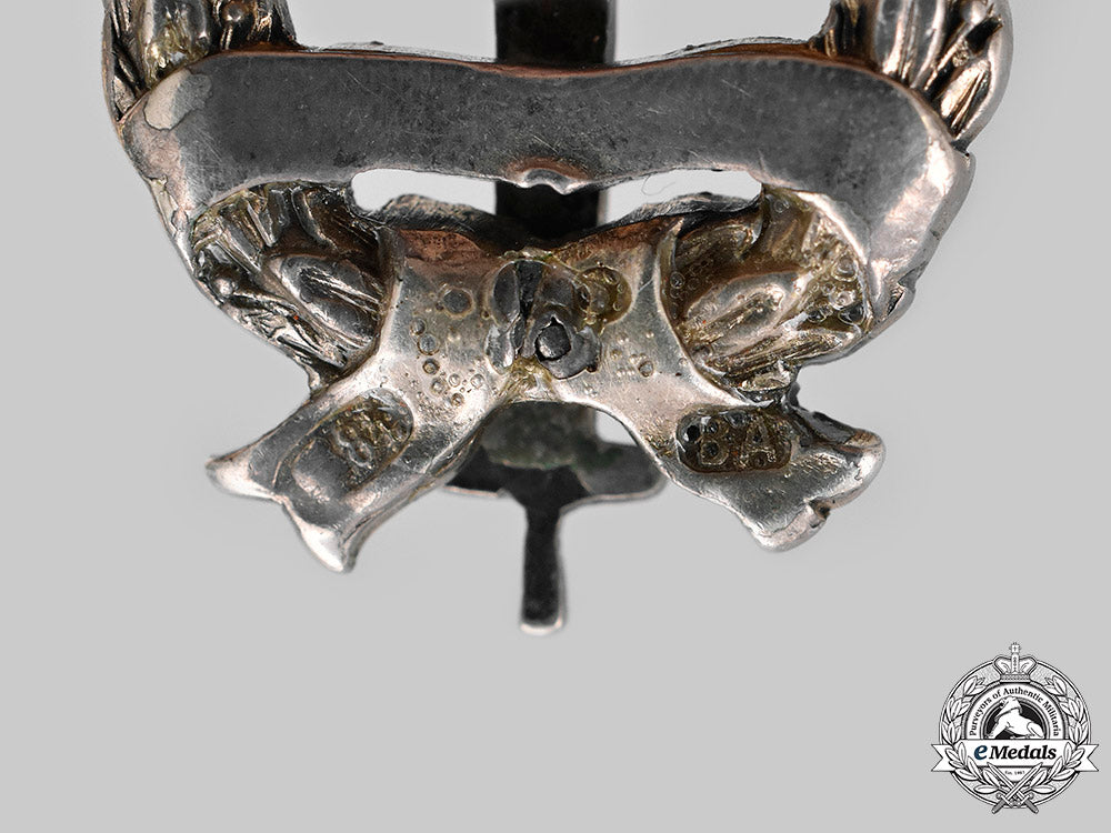Constructed of silver with enamels, on loop for suspension, the obverse consisting of an oval laurel leaf wreath, joined together at the bottom by a blue enameled ribbon bearing a silvered Russian Cyrillic inscription, overlaid by a silver monoplane, the reverse bearing a silver kokoshnik mark of “84” for 875 purity, with a silversmith mark of “ВА”, measuring 22.77 mm (w) x 34.23 mm (h), weighing 9.8 grams, with some wear evident to the enamels, in near extremely fine condition.