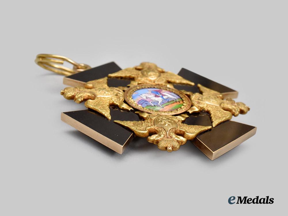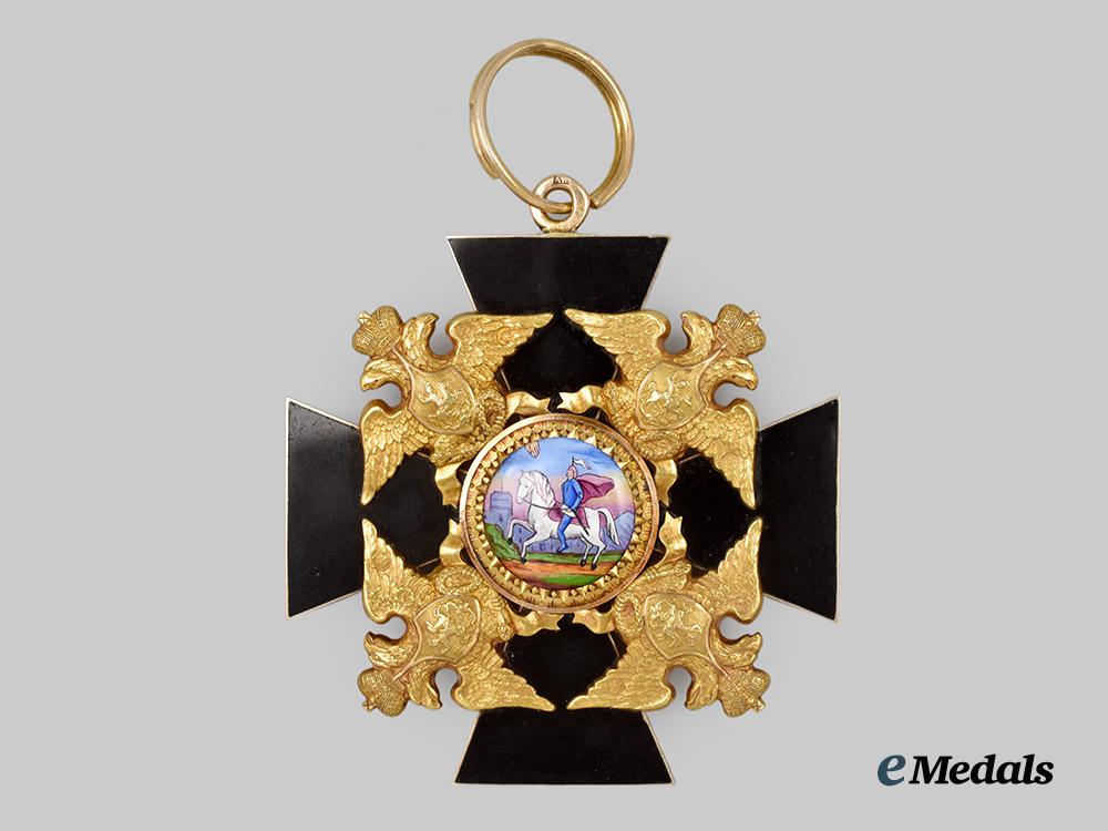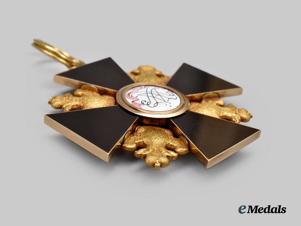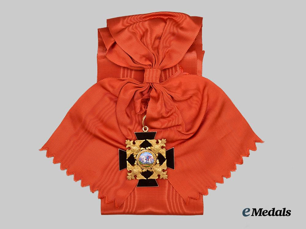 Instituted 1724 by Peter the Great. Type II. (1815-1855). A rare and beautiful decoration, in 14Kt Gold, a black enamelled cross with highly detailed double headed Gold eagles in each quadrant, the obverse medallion exhibits a lovely hand painted St. Alexander Nevsky on horseback, encircled by a etched border, the reverse medallion presents the cursive SA on a white enamel field with red crown and pendilia details, encircled by a smooth Gold ring, the reverse of the eagles demonstrating feathered etchings and cross hatching on the crown, measures 54.7 mm (w) x 60.6 mm (h - inclusive of integral suspension ring), weighs 33.25 grams, marked 56 on ring denoting 14Kt Gold, and AW maker mark denoting manufacture by gold and silversmith August Wendt, St.Petersburg city mark with date 1841, the suspension ring and win of each eagle presents the St. Petersburg mark, accompanied by a later period red silk sash, centerpieces intact, very minor pitting in black enamels, an early decoration in better than extremely fine condition.