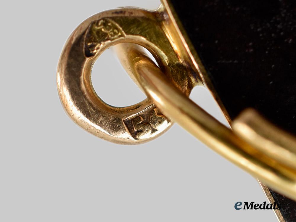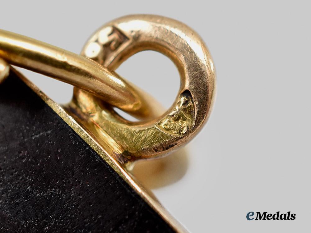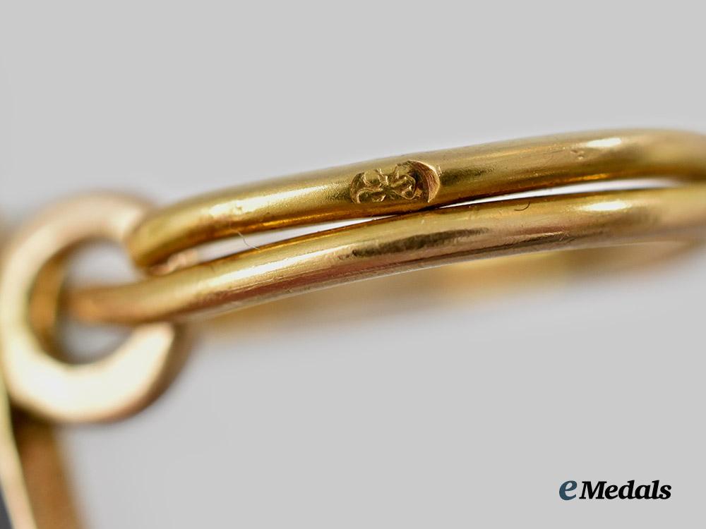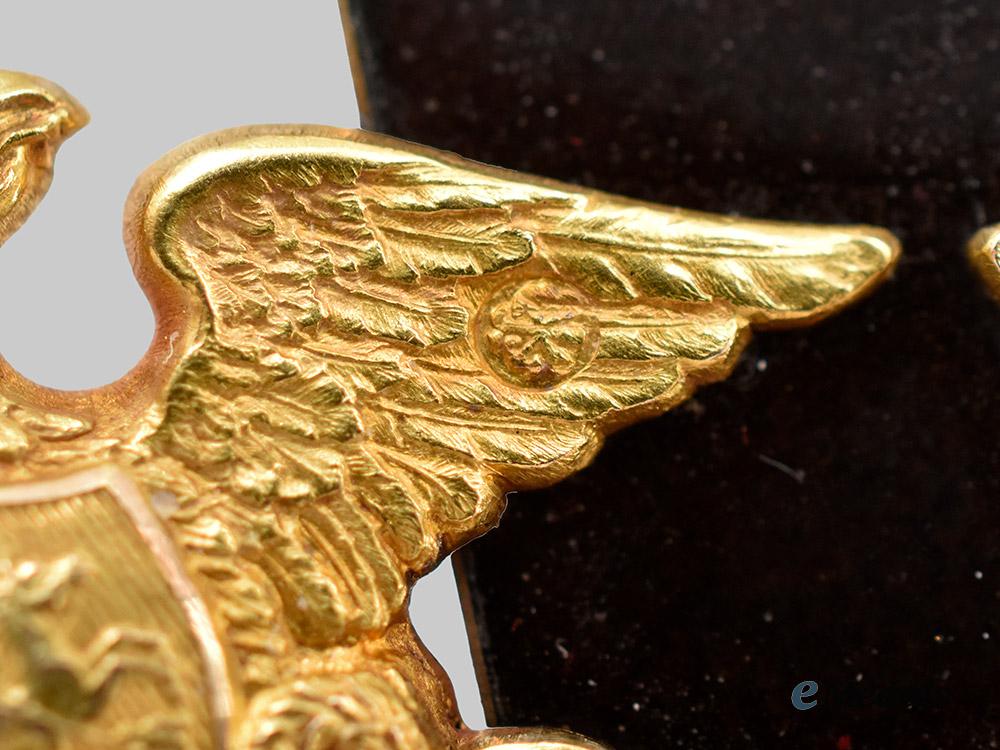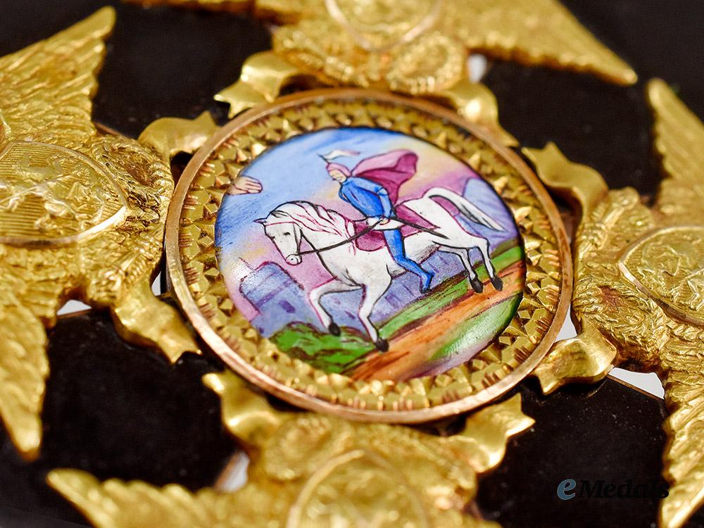 Instituted 1724 by Peter the Great. Type II. (1815-1855). A rare and beautiful decoration, in 14Kt Gold, a black enamelled cross with highly detailed double headed Gold eagles in each quadrant, the obverse medallion exhibits a lovely hand painted St. Alexander Nevsky on horseback, encircled by a etched border, the reverse medallion presents the cursive SA on a white enamel field with red crown and pendilia details, encircled by a smooth Gold ring, the reverse of the eagles demonstrating feathered etchings and cross hatching on the crown, measures 54.7 mm (w) x 60.6 mm (h - inclusive of integral suspension ring), weighs 33.25 grams, marked 56 on ring denoting 14Kt Gold, and AW maker mark denoting manufacture by gold and silversmith August Wendt, St.Petersburg city mark with date 1841, the suspension ring and win of each eagle presents the St. Petersburg mark, accompanied by a later period red silk sash, centerpieces intact, very minor pitting in black enamels, an early decoration in better than extremely fine condition.