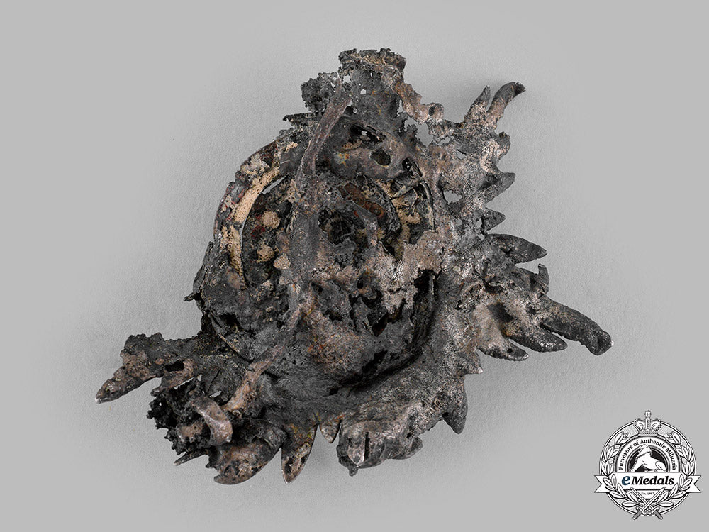 (Орден Святого Станислава). Instituted in 1765. In silver with red and green enamels, fire-damaged, measuring 71 mm (w) x 70 mm (h), exhibiting extensive melting, traces of the enamels remain visible on the obverse, the vertical pinback on the reverse undulated but intact, as found.