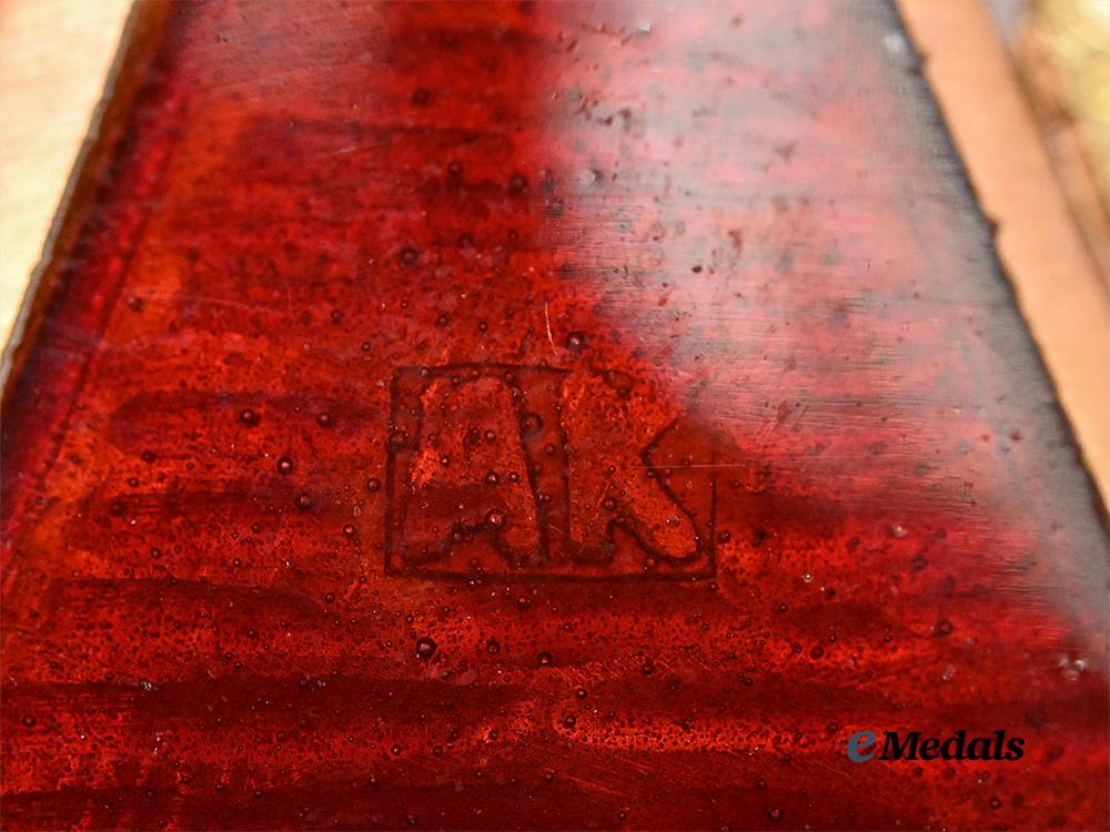 (Орден Святой Анны). Instituted February 14th, 1735. A Cross Pattée constructed of 14kt Gold with red enameled arms, and with ornamented patterns in the quadrants between the arms of the cross, the obverse with a white enameled centerpiece bearing the hand-painted figure of St. Anna, the reverse with a similar white enameled medallion, bearing the hand-painted initials “A.I.P.F.” for the Latin “Anna Imperatoris Petri Filia” (Anna, Emperor Peter’s Daughter), suspended from a raised integral ring and double-looped oval suspension ring for suspension from its ribbon, marked “56” for Gold content on the integral ring, marked AK under the enamels of the reverse 6 o’clock arm denoting manufacture by Albert Keibel, measures 34mm (w) x 39 mm (h), weighs 8.47 grams, worn on a ribbon with notable tattering, small enamel chip on the reverse 9 o’clock, in near mint condition.
