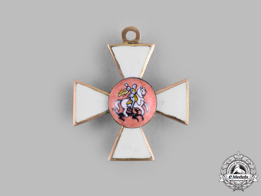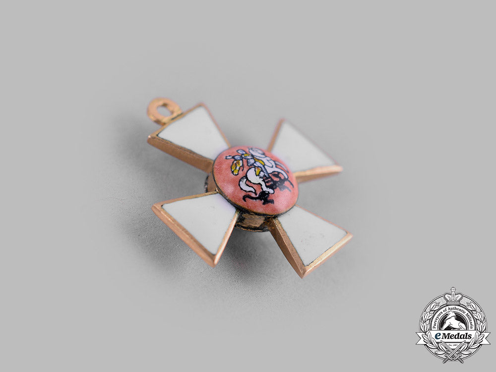 (Императорский Военный Орден Св. Великомученика Победоносца и Чудотворца Георгия). Instituted in 1769. In Gold with white enamels, weighing 1.8 grams, hand-painted obverse centrepiece illustrating St. George slaying the dragon, measuring 15 mm (w) x 17.3 mm (h) inclusive of its integral ring, intact enamels, extremely fine.
