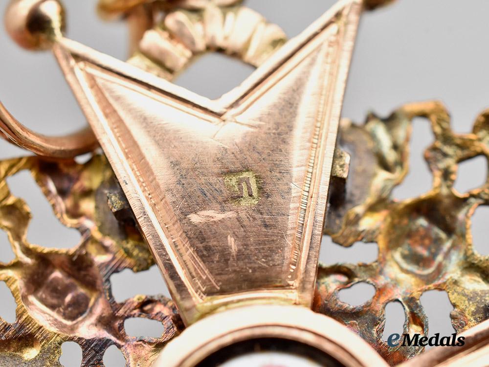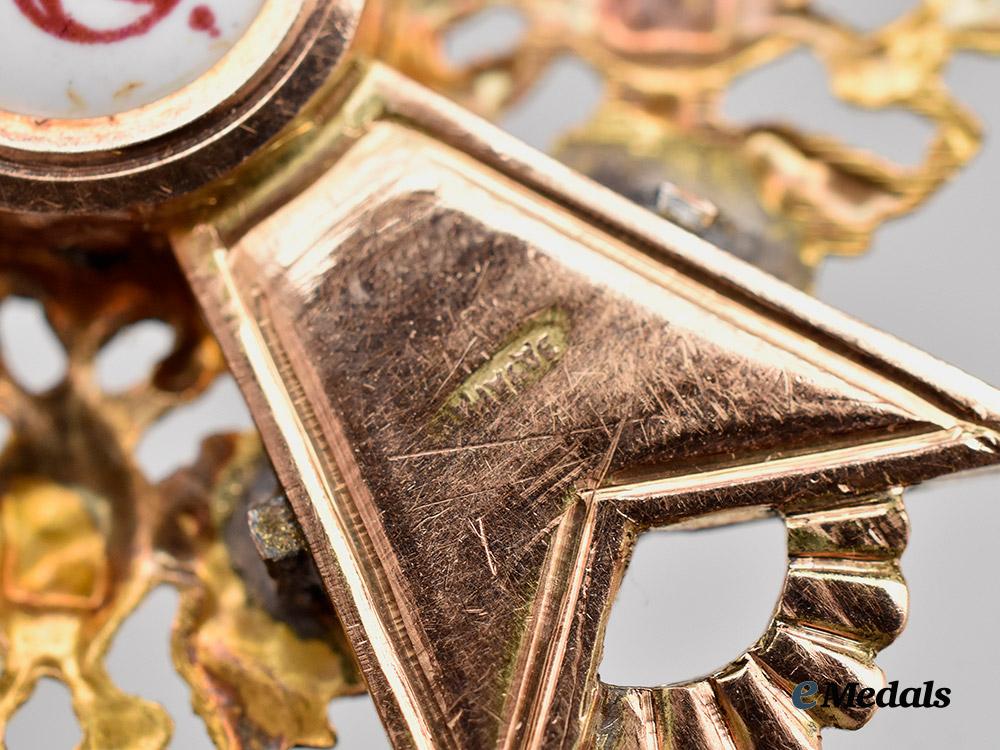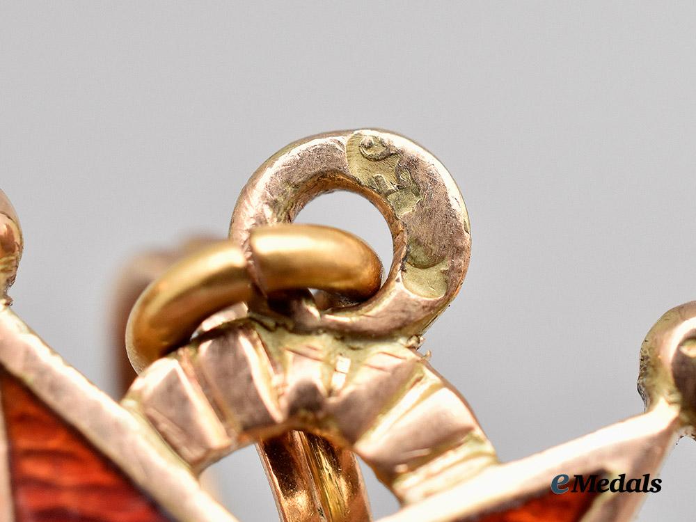 (Орден Святого Станислава). Instituted on 7 May 1765. Civil Division. Constructed of 14 Kt Gold, a red-enamelled eight-pointed Maltese cross, with gold Russian double-headed imperial eagles between its arms, in addition to semi-circles of gold rays between each points of the arms of the cross, with a central medallion bearing the letters “SS” in red paint on a white enamelled background, surrounded by a green enamel laurel wreath, the reverse shows plain Gold arms as well as a white enamelled centre, hand-painted “SS” in red, maker marked on reverse however worn and illegible, with a partial 56 gold mark on the ring, measures 42.7 mm (w) 44.9mm (h), weighs 10.58 grams, with reverse having been polished and borders of Maltese cross re-etched, replacement gold ring, inclusive of new ribbon, fine.