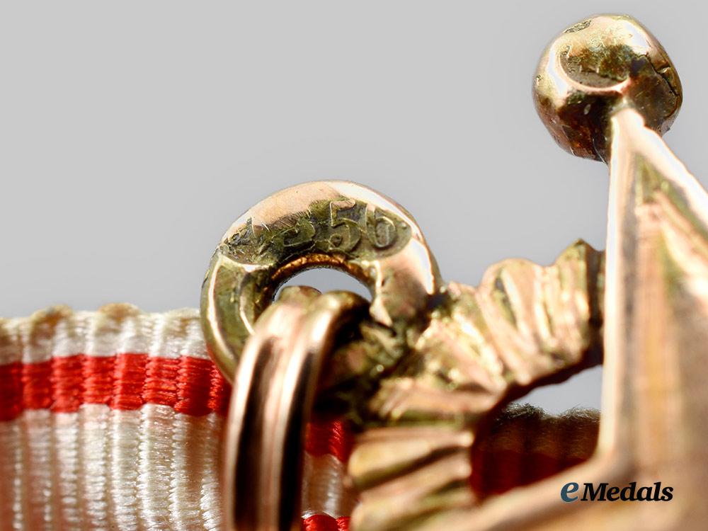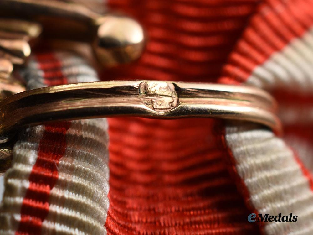 (Орден Святого Станислава). Instituted in 1765. Type II (1856-1917). In 14K Gold, a red enamelled Maltese cross with ball finials and an arch in the knee of each arm, double-headed eagles with swords in each quadrant, the obverse and reverse centerpieces present a hand-painted "S", the reverse in gold bearing multiple marks including the zolotniki fineness number "56" (14K Gold) on the suspension ring, beside the kokoshnik mark and makermark for Eduard (“ЗДУАРАЪ") on the 6 o’clock arm, measuring 39.94 mm (w) x 44.18 mm (h - inclusive of integral suspension ring), weighs 16.52 grams (including ribbon), worn on a beautiful period bow ribbon, intact enamels, original ribbon, extremely fine.